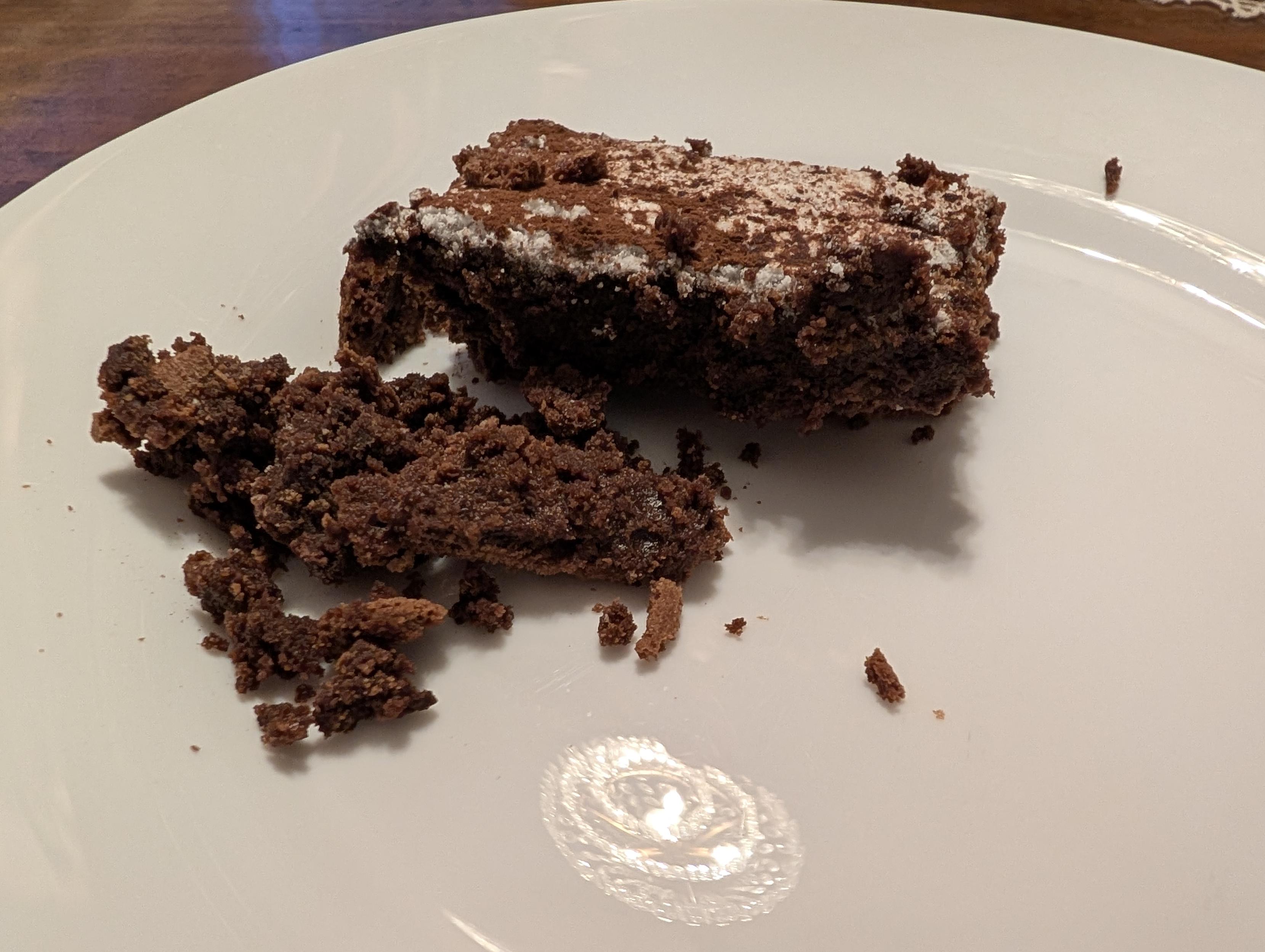 A partially eaten slice of tenerina, a dense chocolate cake, sits on a white plate with loose crumbs scattered beside it and a light dusting of powdered sugar on top.
