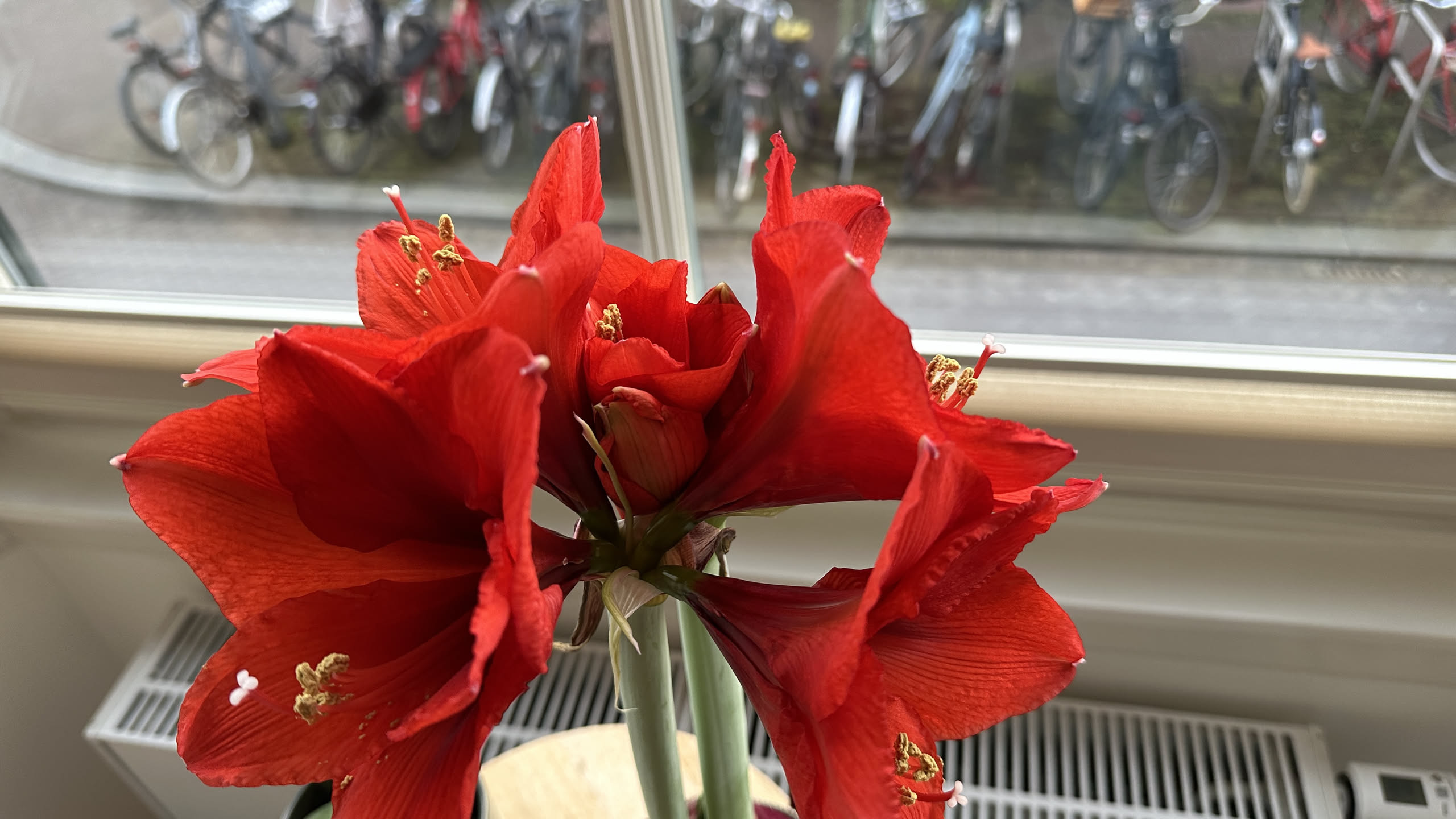 intense red flowers atop a tiny stalk. blurry bicycles are in the background.