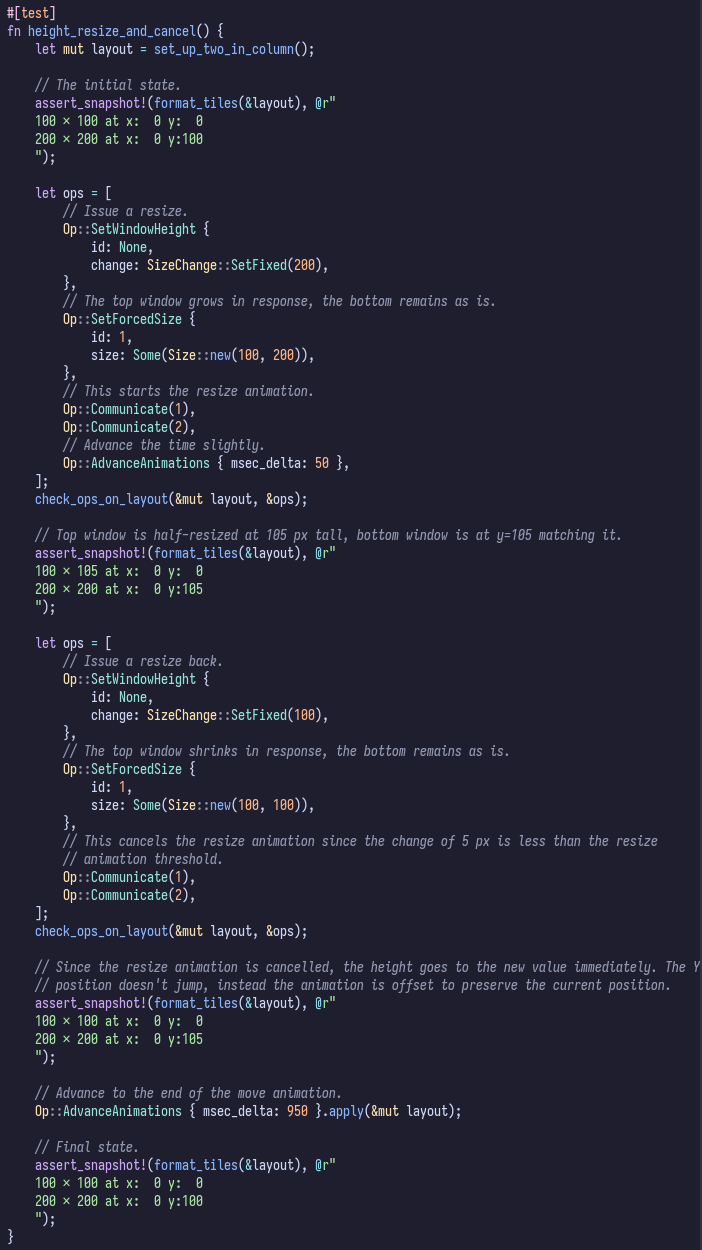 Test code that issues resizes, advances time, and prints window sizes and positions at different carefully controlled points.