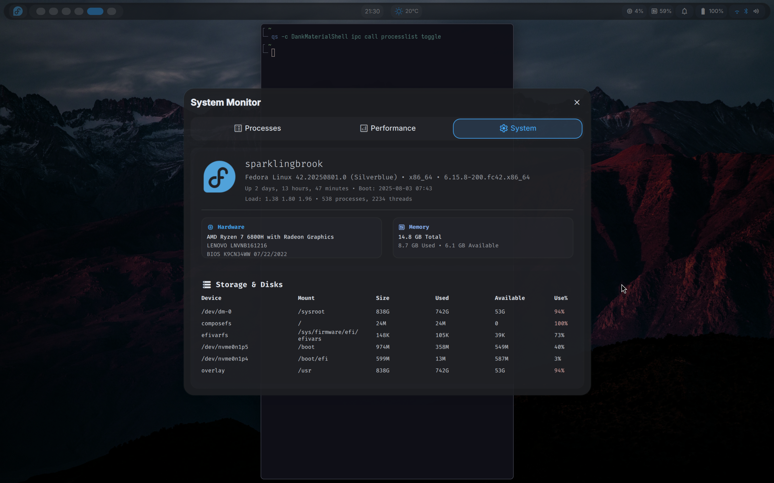 niri with DankMaterialShell's system info dialog open