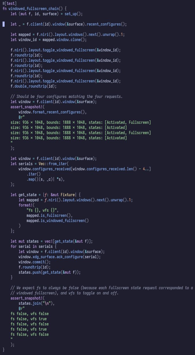 Screenshot of a test case which toggles windowed fullscreen several times, then the window commits in response to each, and we verify the state in between.