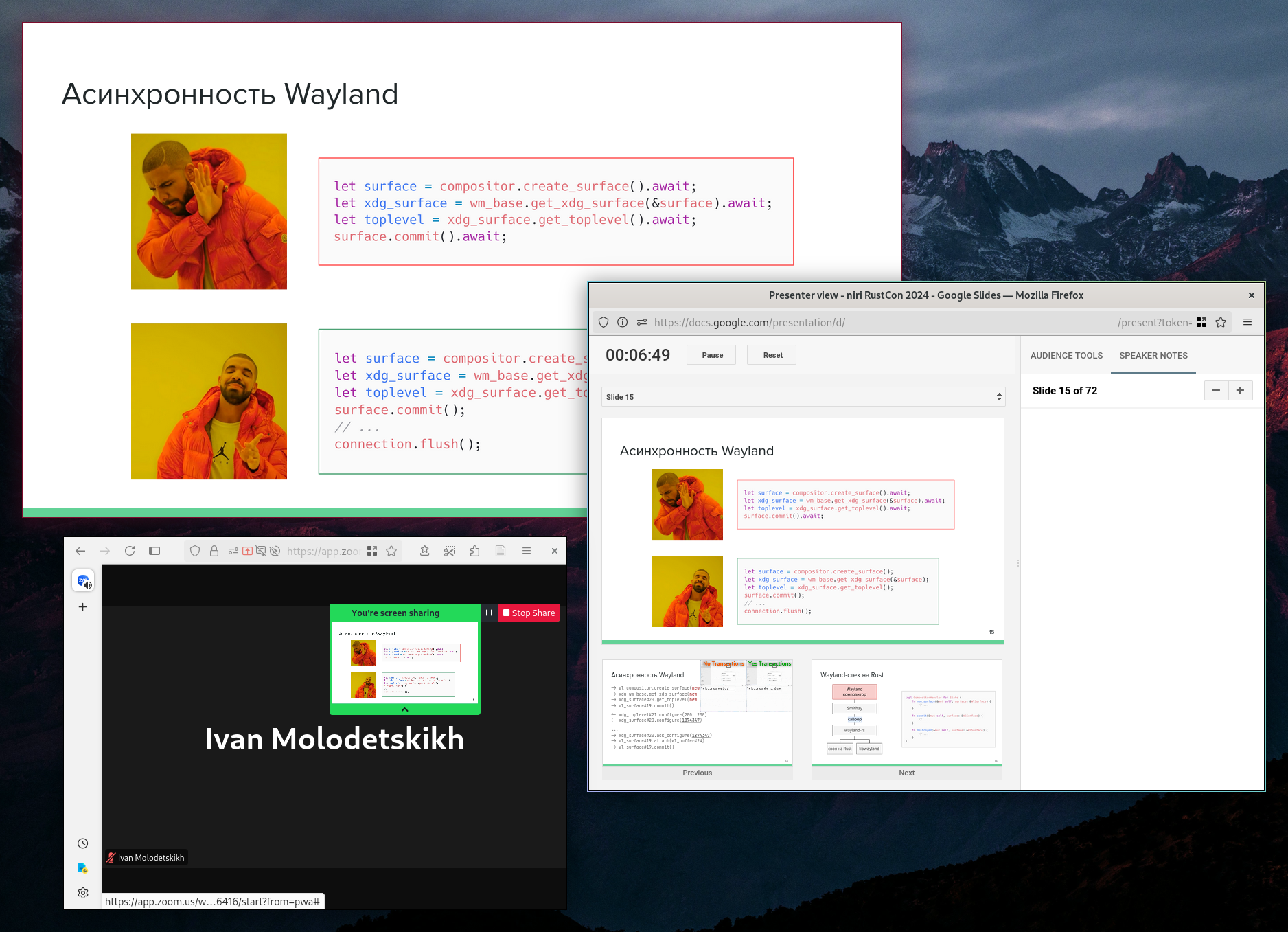 Windowed Google Slides presentation, another window showing the presenter view, and another window showing Zoom UI casting the presentation.