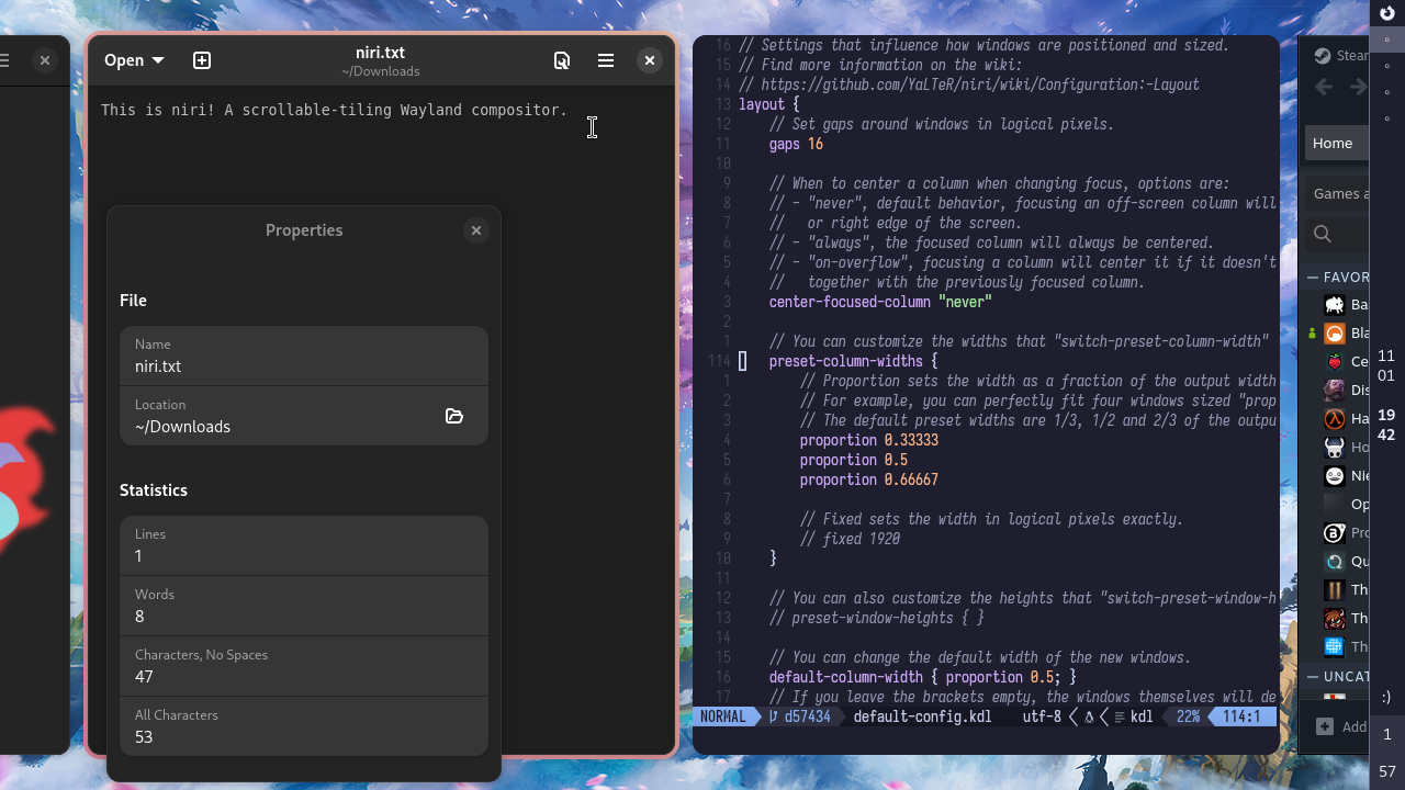 A few windows side-by-side in niri, including a floating dialog and a Steam.