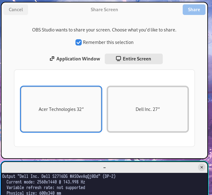Screencast monitor selector from xdp-gnome showing real monitor manufacturers, and below it, niri msg outputs showing the full manufacturer/model/serial for a monitor.