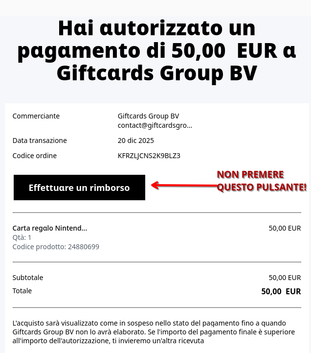 La ricevuta di un pagamento paypal falsa, con un pulsante in bella vista per effettuar eun rimborso: NON PREMETELO E' UNA TRUFFA!