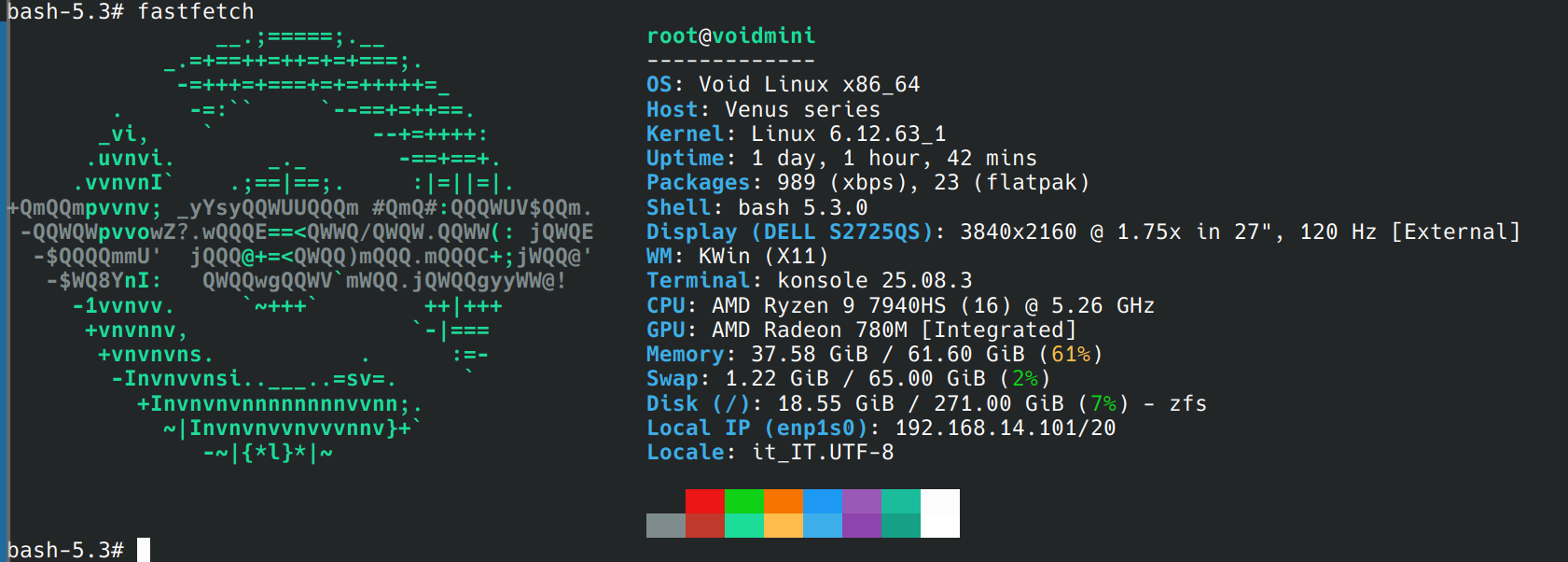 Screenshot of a terminal window running the command "fastfetch" as root. On the left, there is a large ASCII art logo associated with Void Linux rendered in green and cyan characters on a dark background. On the right, system information is listed in colored text. The prompt shows "root@voidmini". Details include: operating system Void Linux x86_64, host Venus series, kernel Linux 6.12.63_1, uptime of 1 day, 1 hour, 42 minutes, and package counts of 989 via xbps and 23 via flatpak. The shell is bash 5.3.0. Display information shows an external Dell S2725QS monitor at 3840 by 2160 resolution, scaled 1.75x, 27 inches, 120 Hz. Window manager is KWin on X11, terminal is Konsole 25.08.3. Hardware details list an AMD Ryzen 9 7940HS CPU with 16 cores up to 5.26 GHz, AMD Radeon 780M integrated GPU, 61.60 GiB of RAM with 37.58 GiB used, swap of 65.00 GiB with 1.22 GiB used, and a ZFS root filesystem using 18.55 GiB of 271.00 GiB. Network information shows local IP 192.168.14.101 on interface enp1s0. Locale is it_IT.UTF-8. A small color palette bar appears at the bottom.