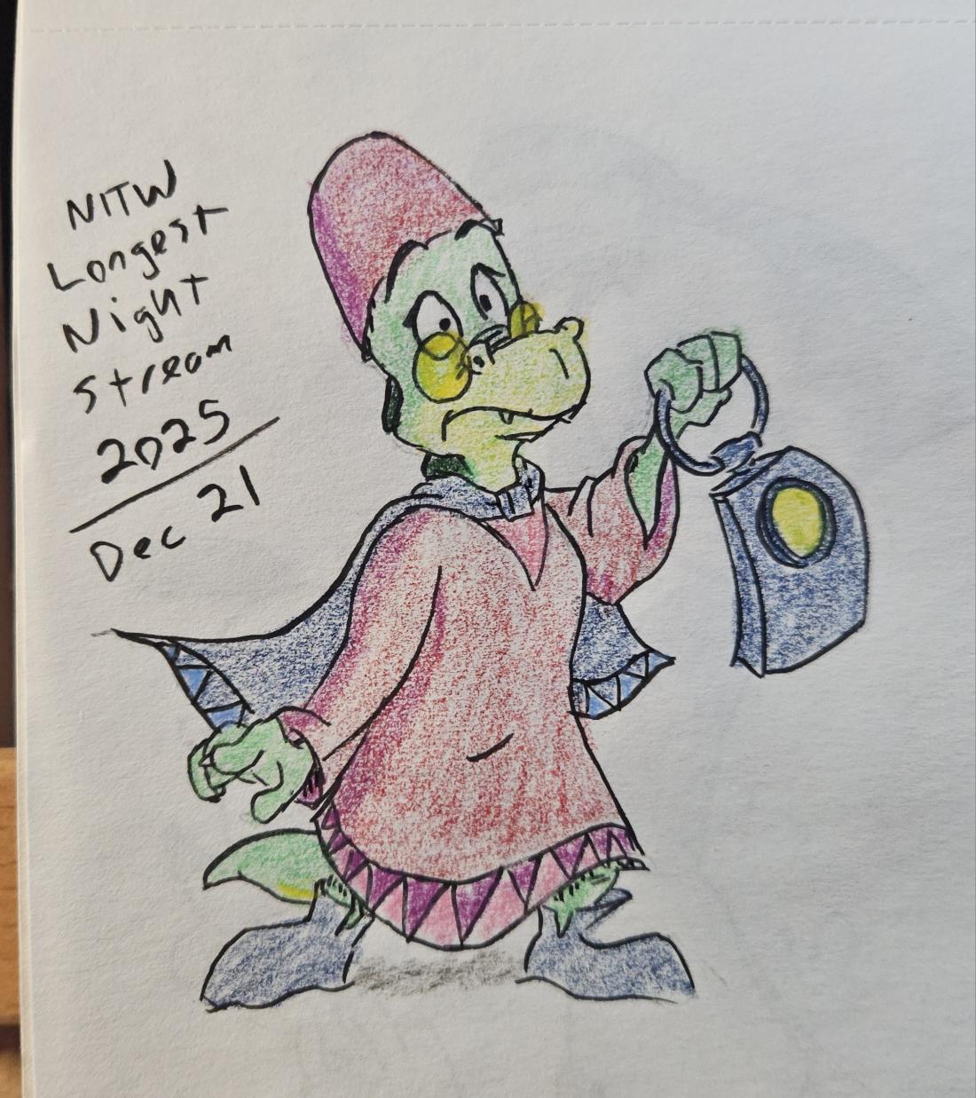 Drawing of a cartoon alligator dressed for winter, holding up a lamp. Written next to her is the text "NITW Longest Night Stream 2025 -- Dec 21"