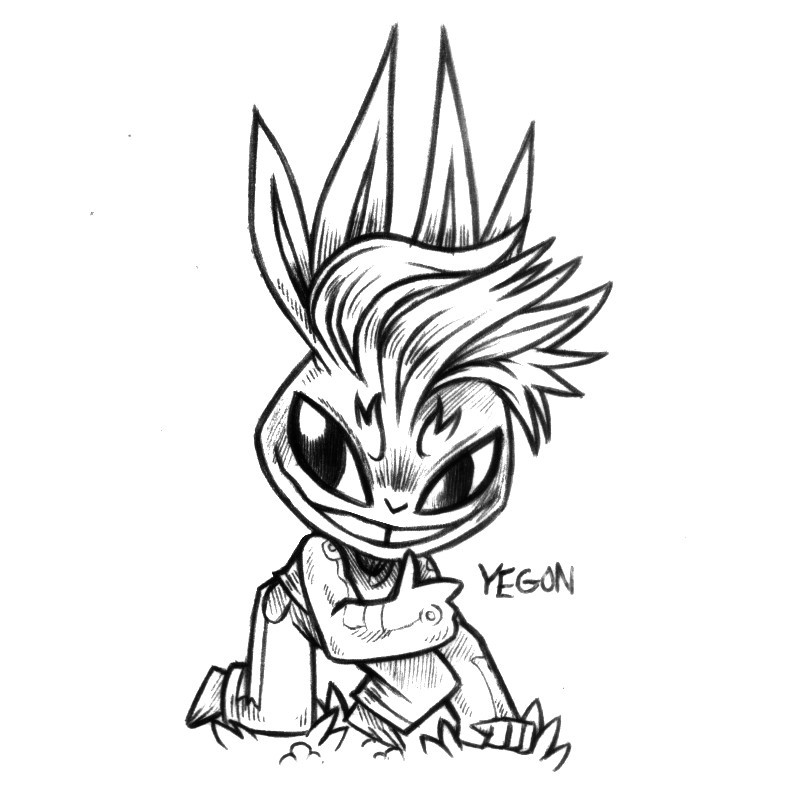 an ink drawing of a humanoid rabbit named Yegon, leaning forward on one hand and knee, and giving a thumbs up. They have a wide grin with a tooth gap, eyebrows that resemble little flames and long swooping bangs that are brushed to the side. Yegon's ears are each split in 2.