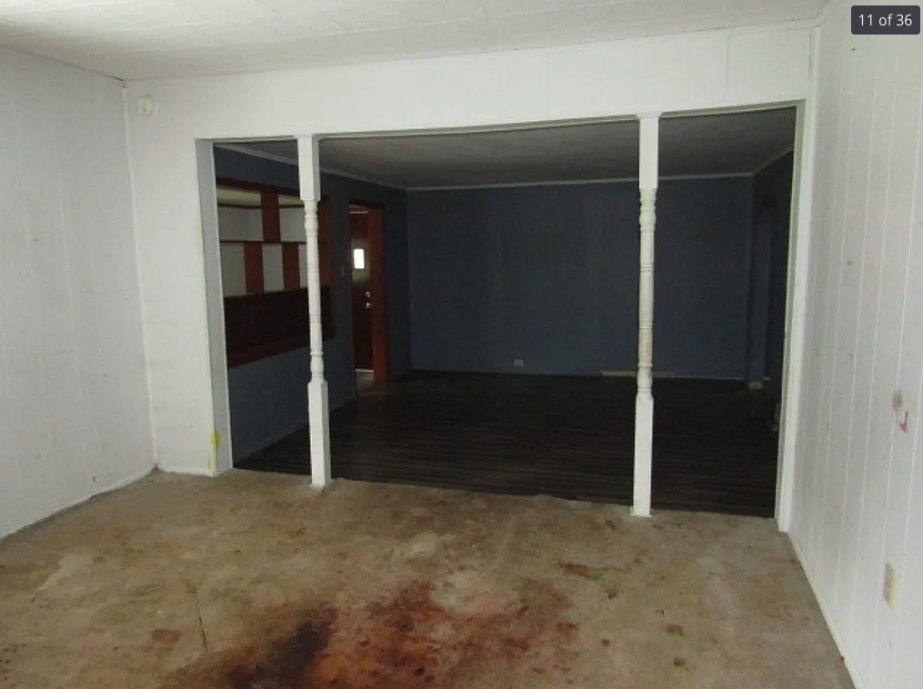 A living room with a carpet hugely stained by what looks like blood or dark red paint. It is empty and dark.