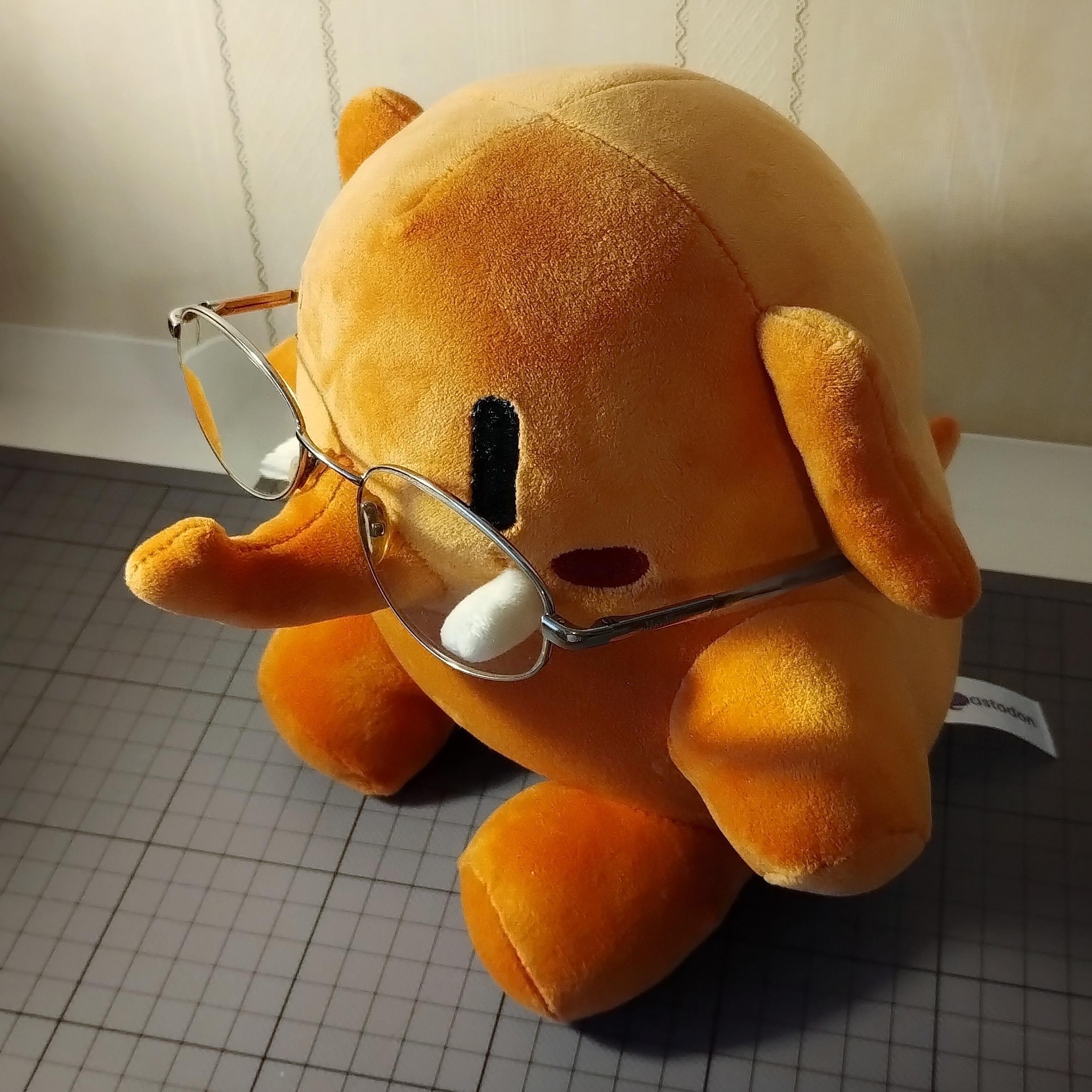 Ein PlΓΌsch-Mastodon-Maskottchen mit Brillen.