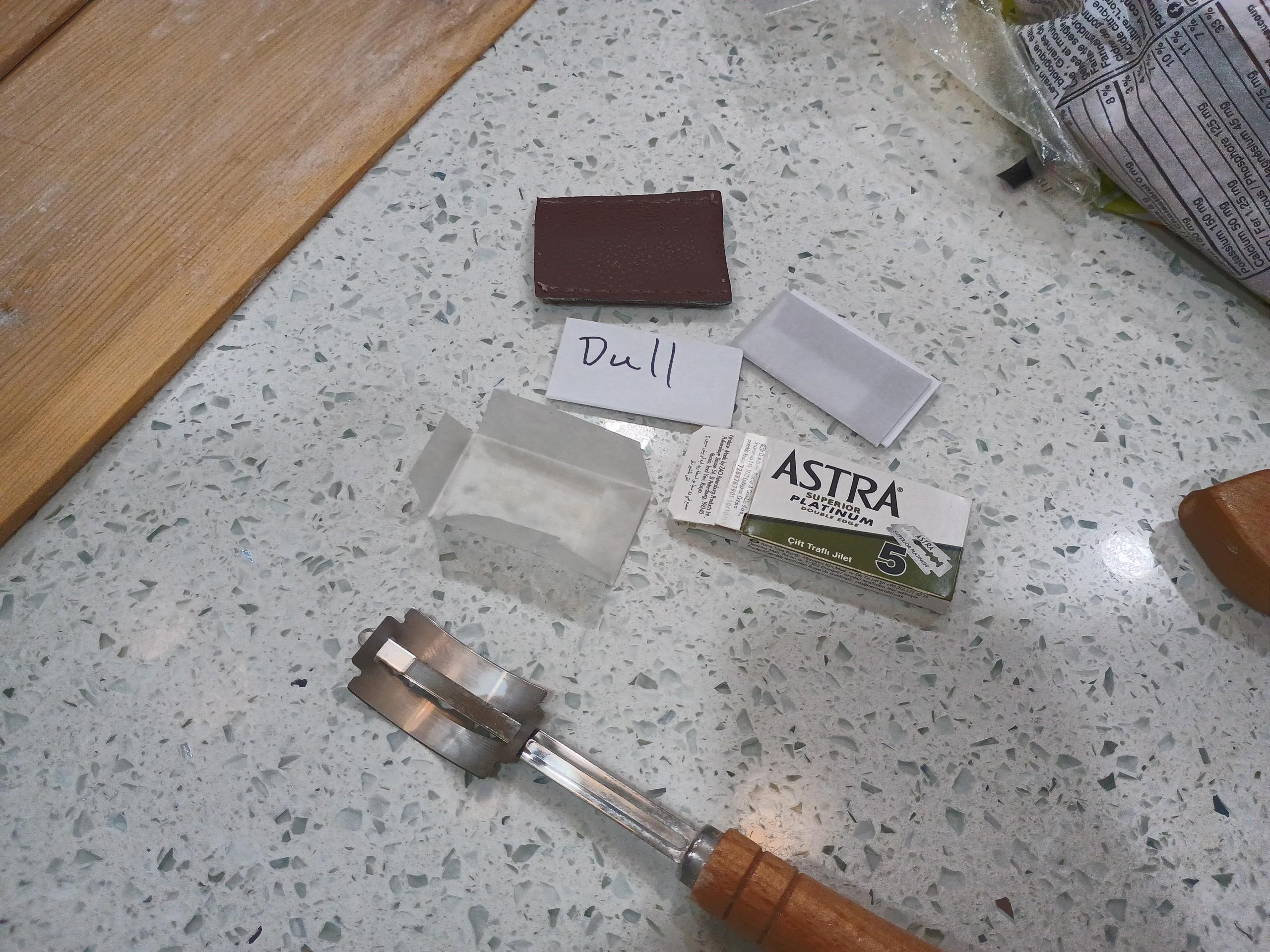 Some fresh razor blades and the papers from old ones are shown along with the handle that holds a blade for slashing bread tops