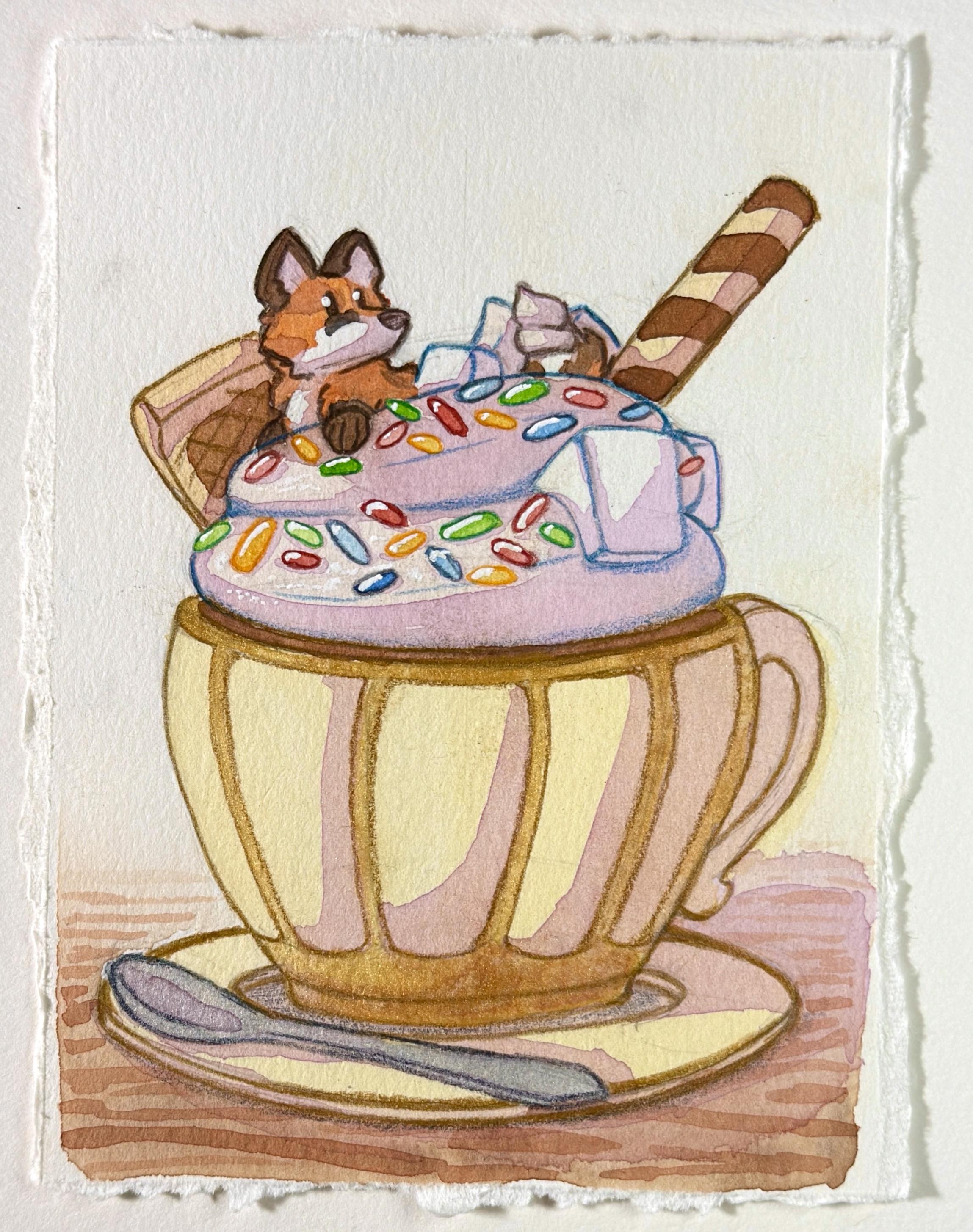 A watercolor painting of a cup containing hot chocolate, whipped cream, marshmallows and sprinkles. Ontop the cream sits a tiny fox.