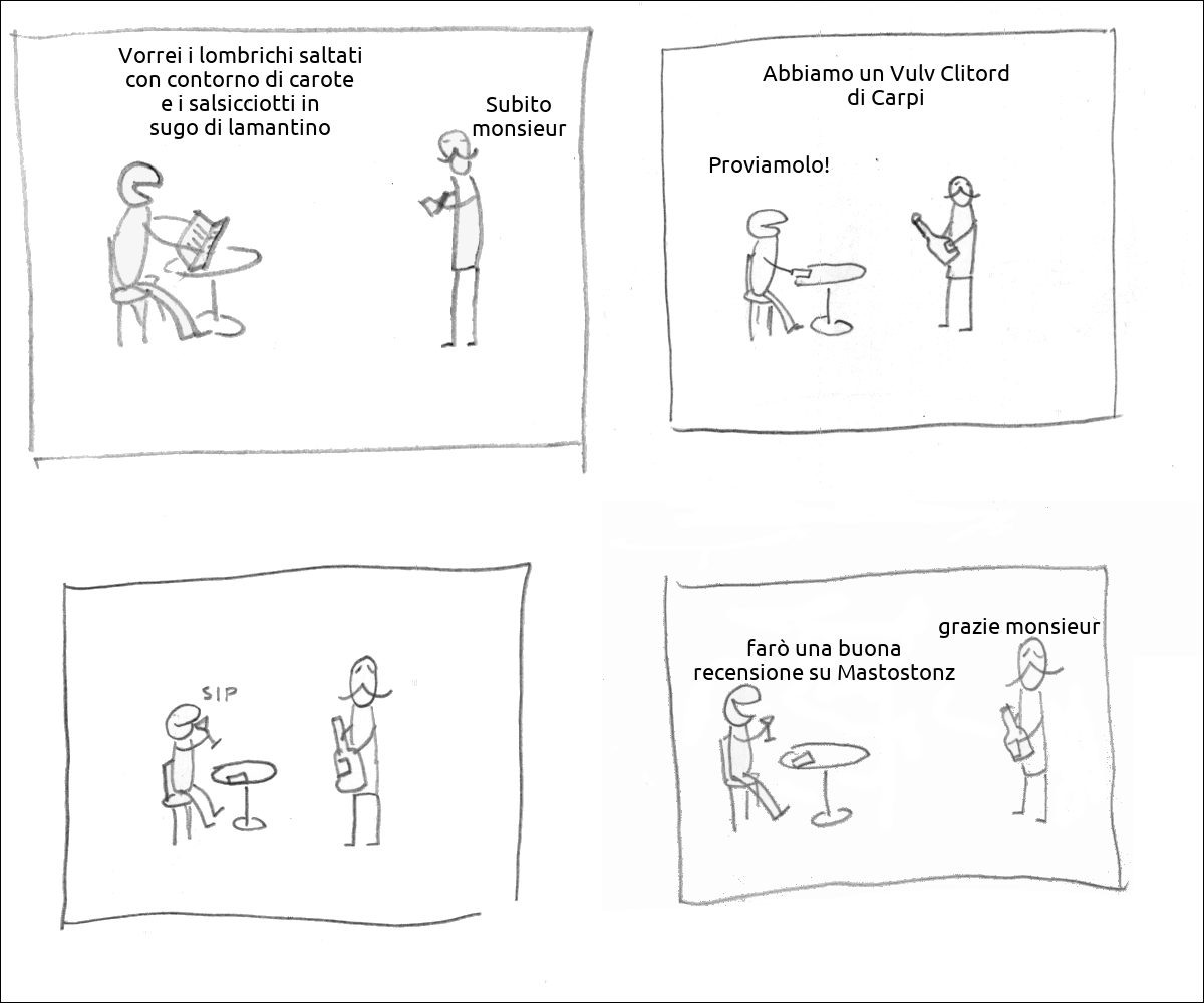 al ristorante un tizio ordina: «Vorrei i lombrichi saltati con contorno di carote e i salsicciotti in sugo di lamantino» e il cameriere: «Subito monsieur» il cameriere propone: «Abbiamo un Vulv Clitord di Carpi» e il cliente risponde: «Proviamolo!» il cliente assaggia il vino il cliente soddisfatto dice: «farò una buona recensione su Mastostonz» e il cameriere ringrazia: «grazie monsieur»