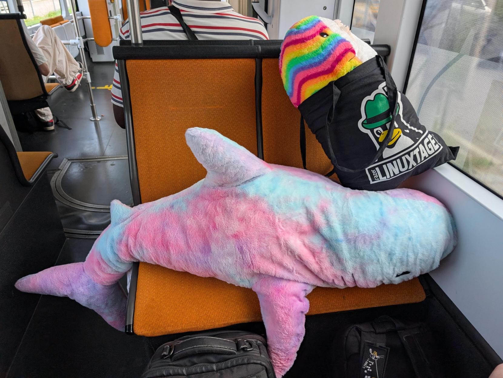 Two Blåhajs on tram seats; a very large one is covering two seats, and a large one is stuffed into a fabric bag