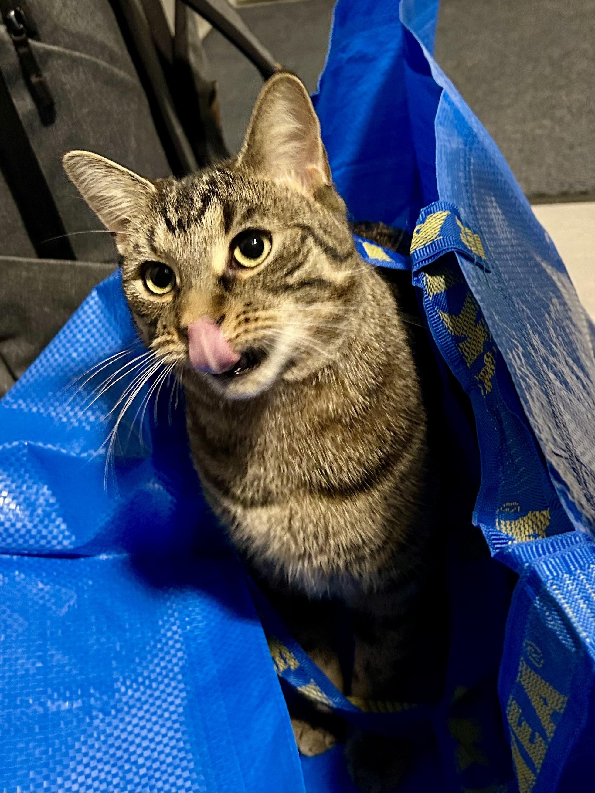 A photo of Mini, still sitting in the bag, caught mid-mlem (tongue covering his nose), with a bit of motion blur on his face.
