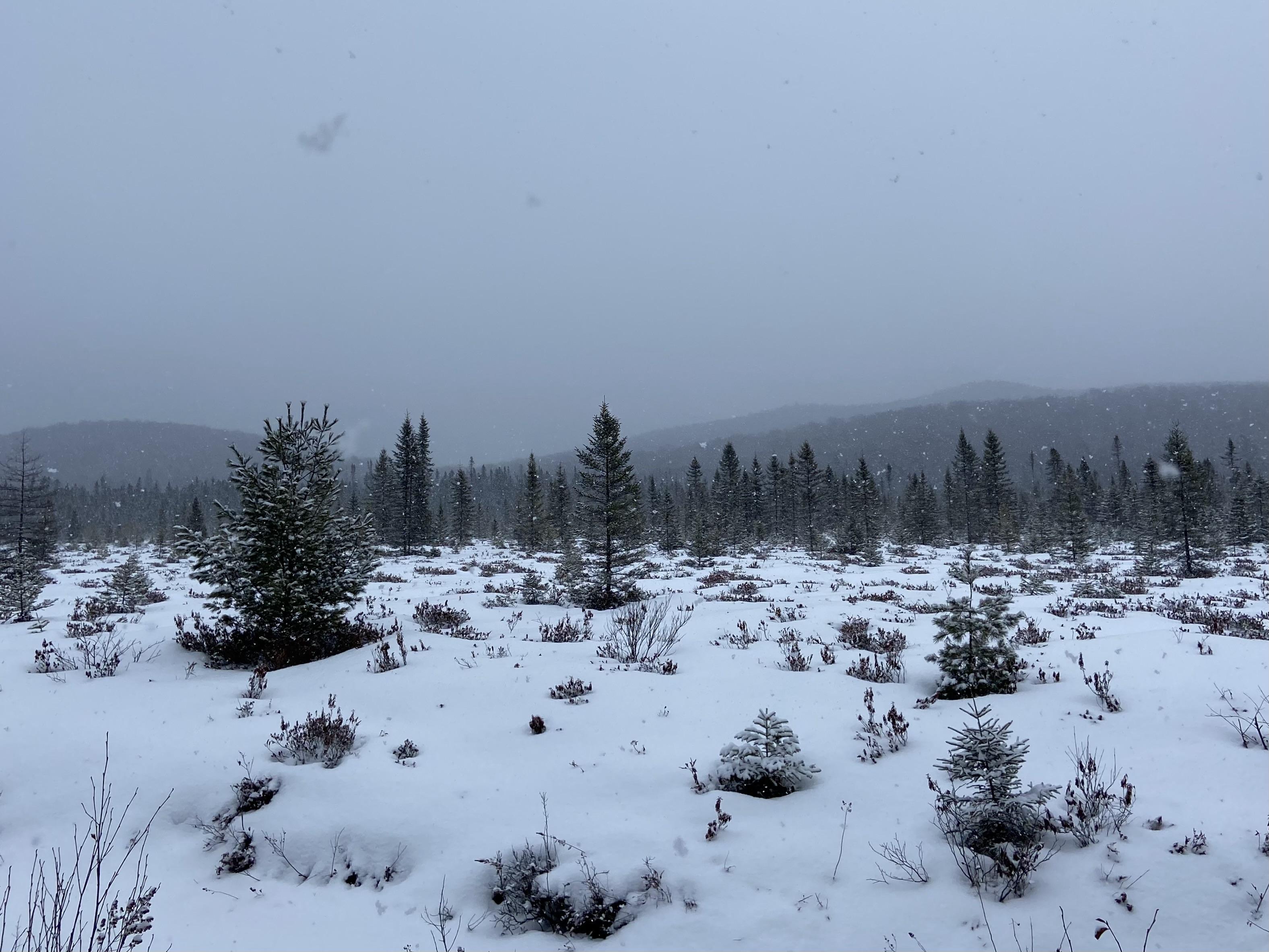 A snowy bog in the Adirondacks, a few small evergreen trees sticking out of snow. In the distance, hills and mountains are fading into mist and clouds. We can see a big fluffy snowflake falling. The photo looks black and white, but it's color.