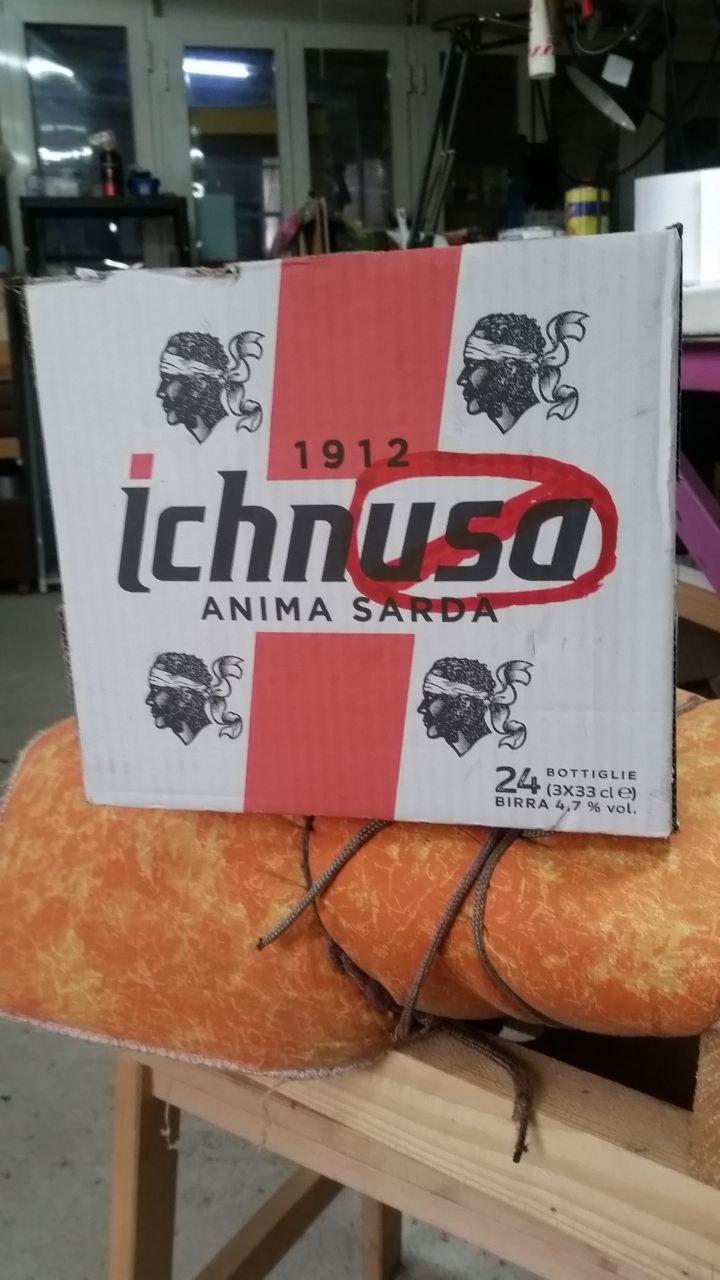 Lato di una scatola di birra Ichnusa con la parte "usa" sbarrata tipo cartello di divieto.