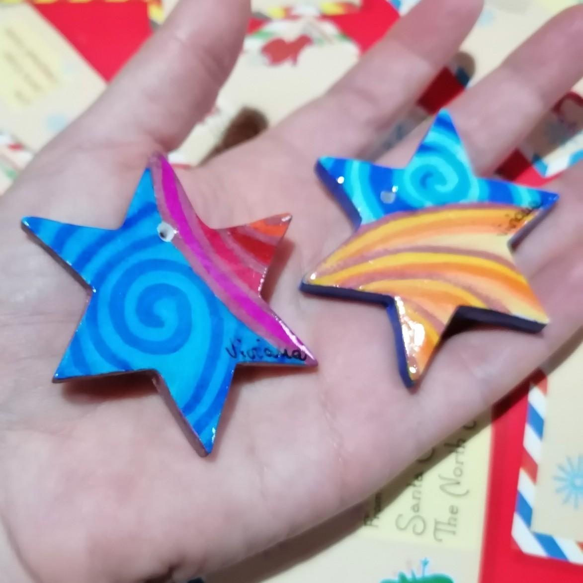 In queste 4 immagini, stelle dipinte o decorate in vari modi (disegni astratti policromi, candele e agrifoglio, bastoncino di zucchero e agrifoglio) da usare come biglietti d'auguri e, poi, come decorazioni dell'albero di Natale