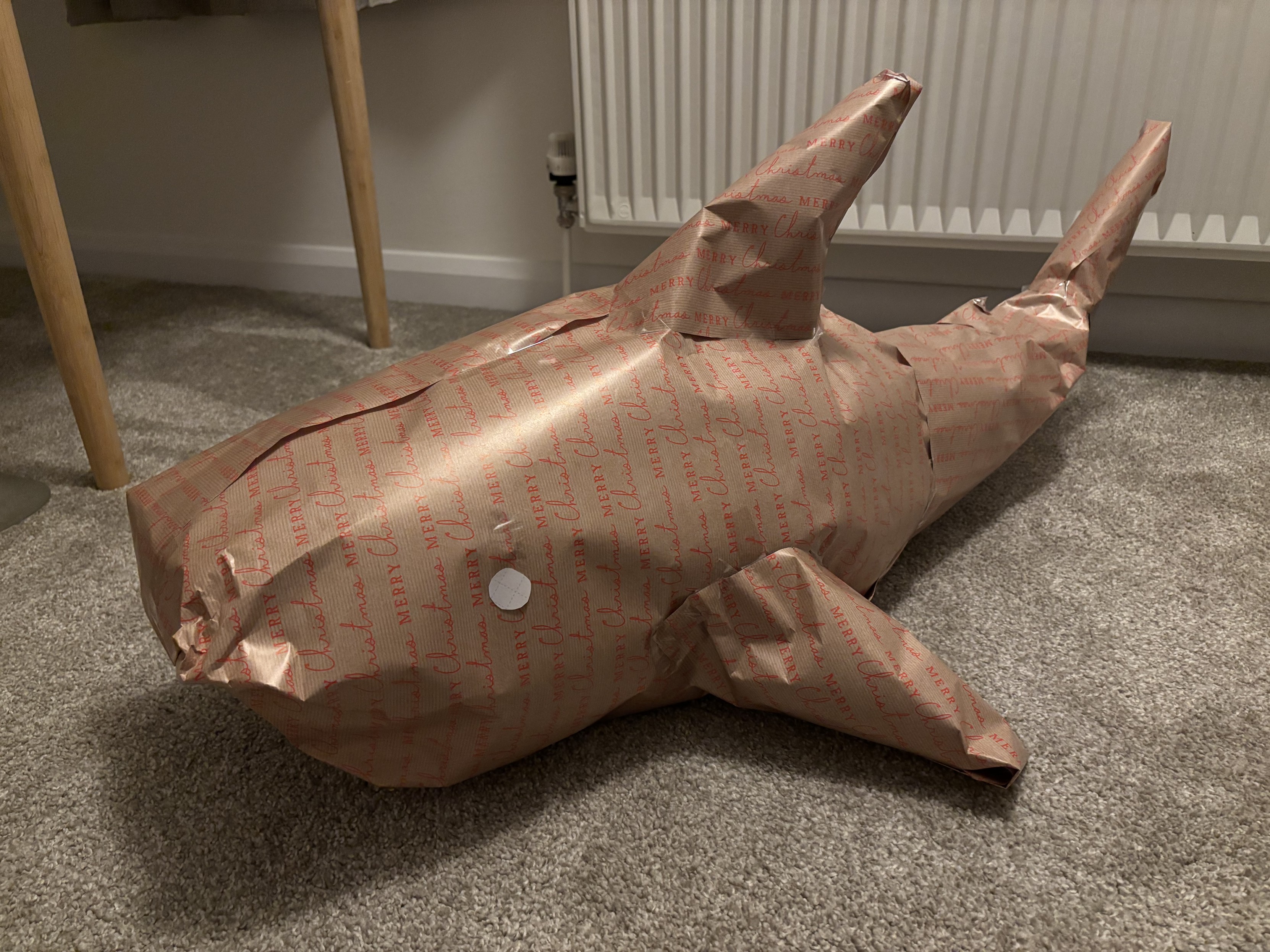 A gift-wrapped Blåhaj, in a very obvious Blåhaj shape.