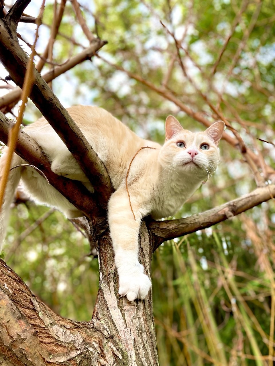 Foto di gatto bianco appollaiato su alcuni rami di albero