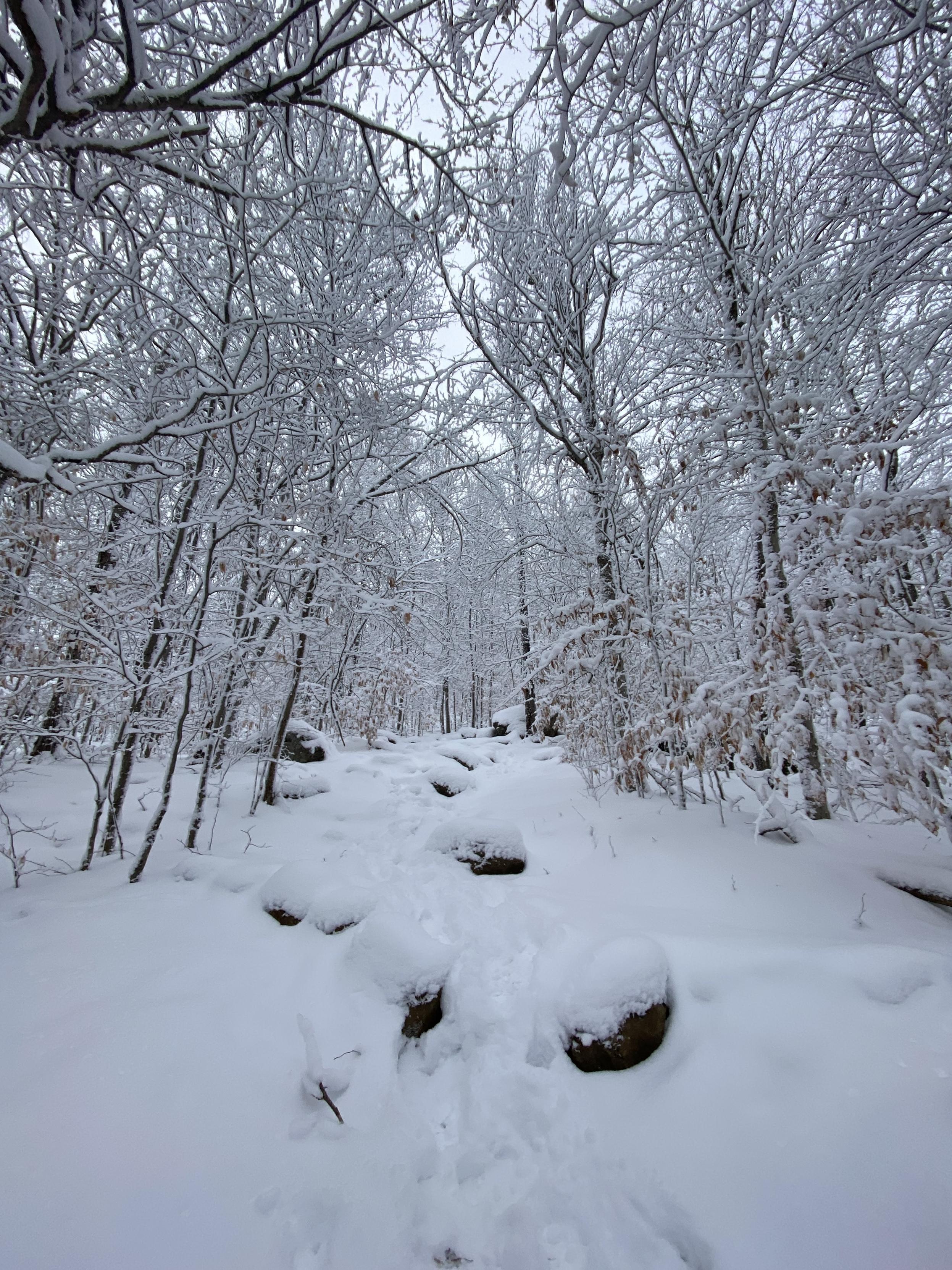 A snowy path in a forest. It looks black and white. The tree trunks are dark and there's deep white snow, and gray sky.