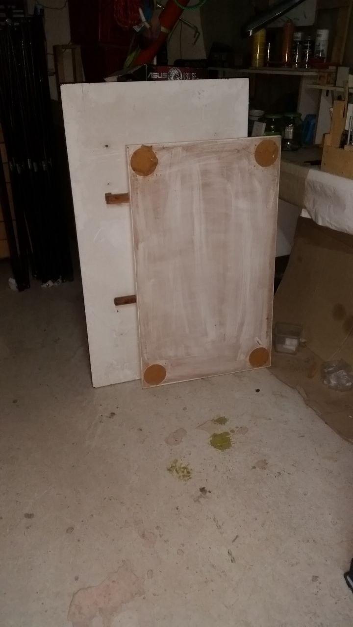 Due tavoli bianchi provenienti da qualche cucina, visti dal lato inferiore.