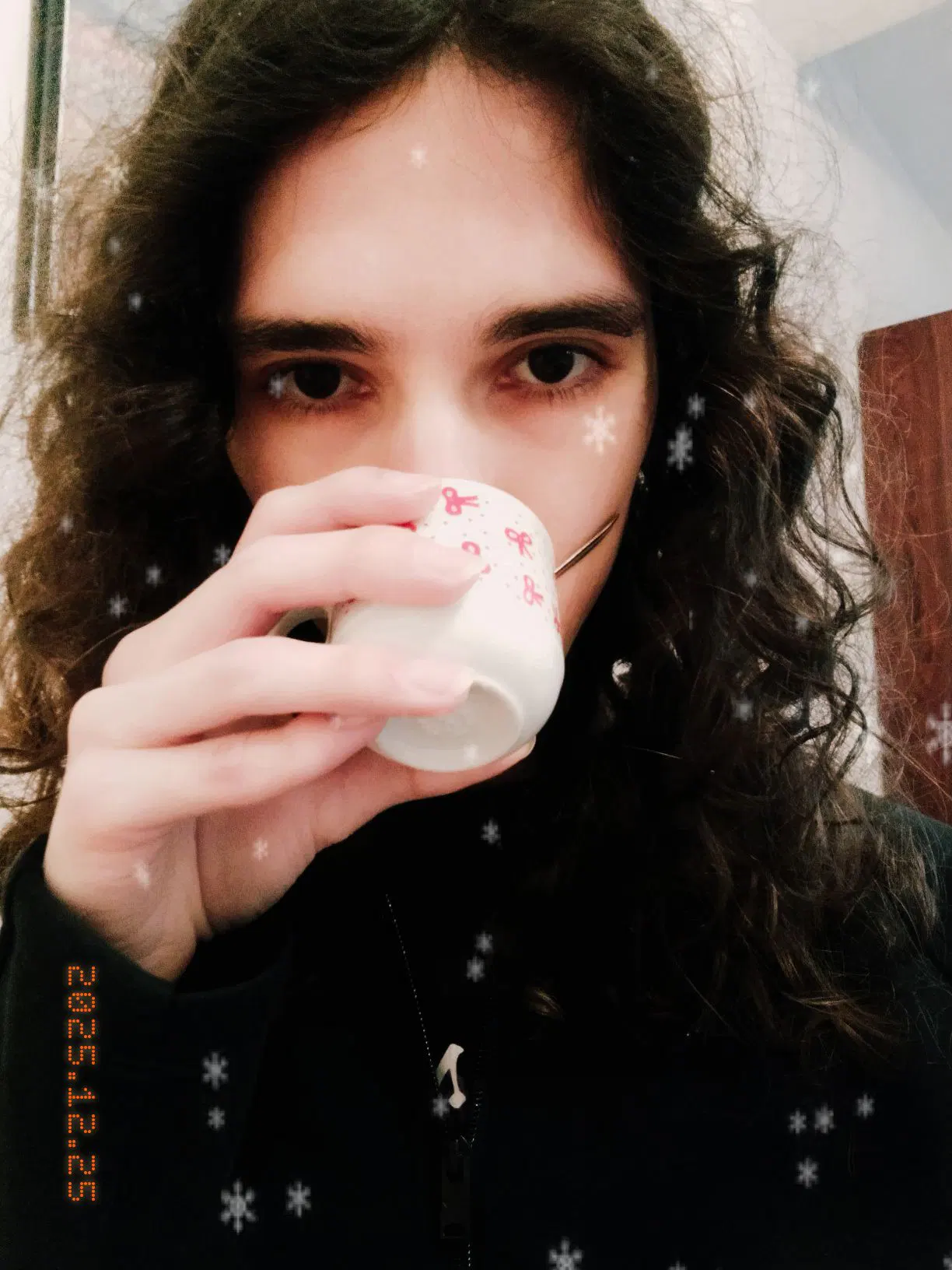 Selfie di me mentre bevo dalla tazzina
