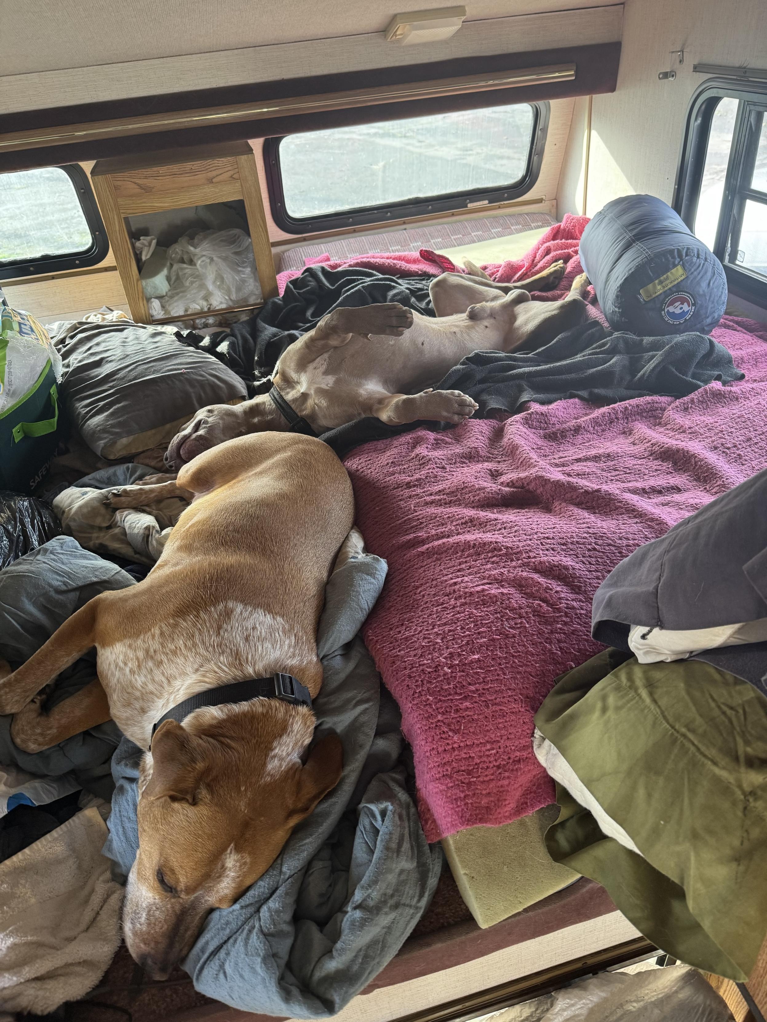 Two dogs are lying on a bed covered with blankets and pillows inside a camper. The space appears cozy and cluttered, with a small window allowing natural light to enter.
