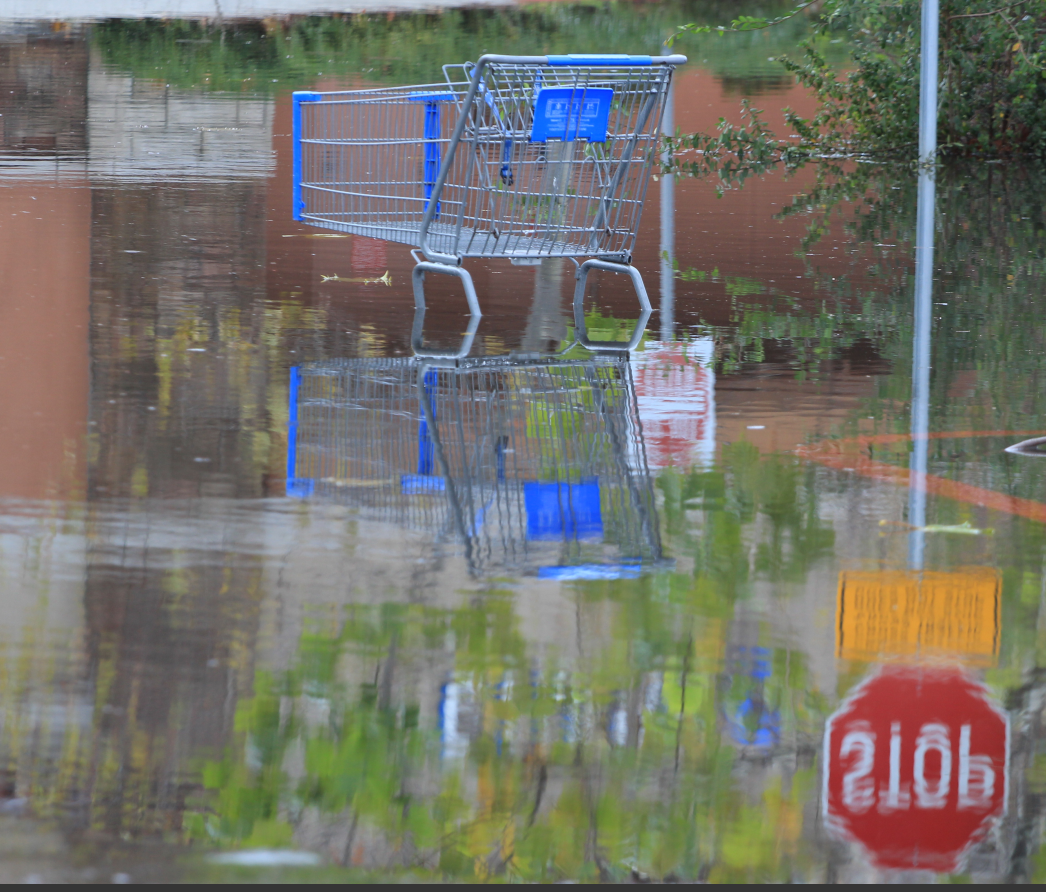 Shopping cart in floodwater, with a "STOP" sign reflected in the water.