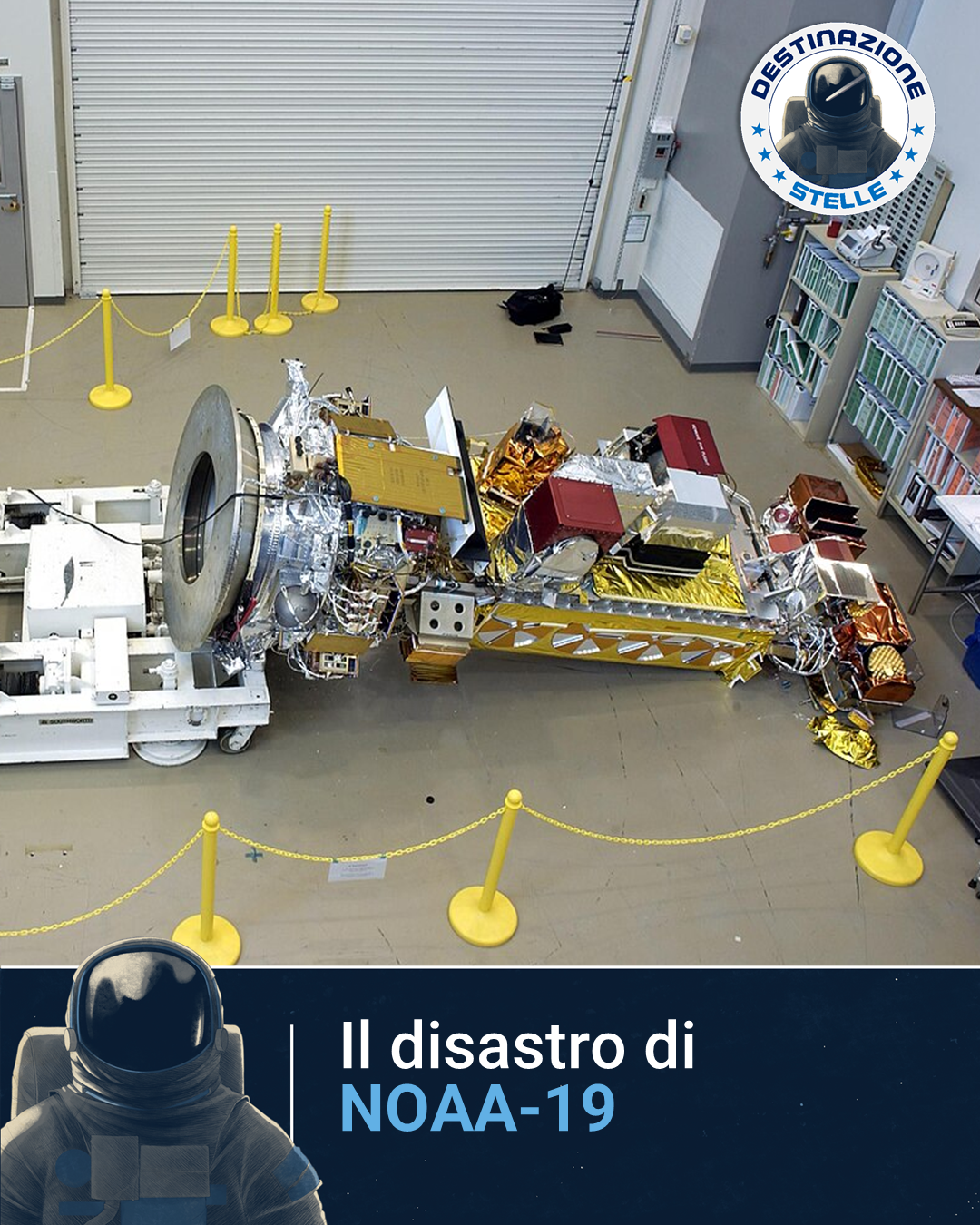 Fotografia del satellite NOAA-19 caduto a terra con la scritta "Il disastro del NOAA-19