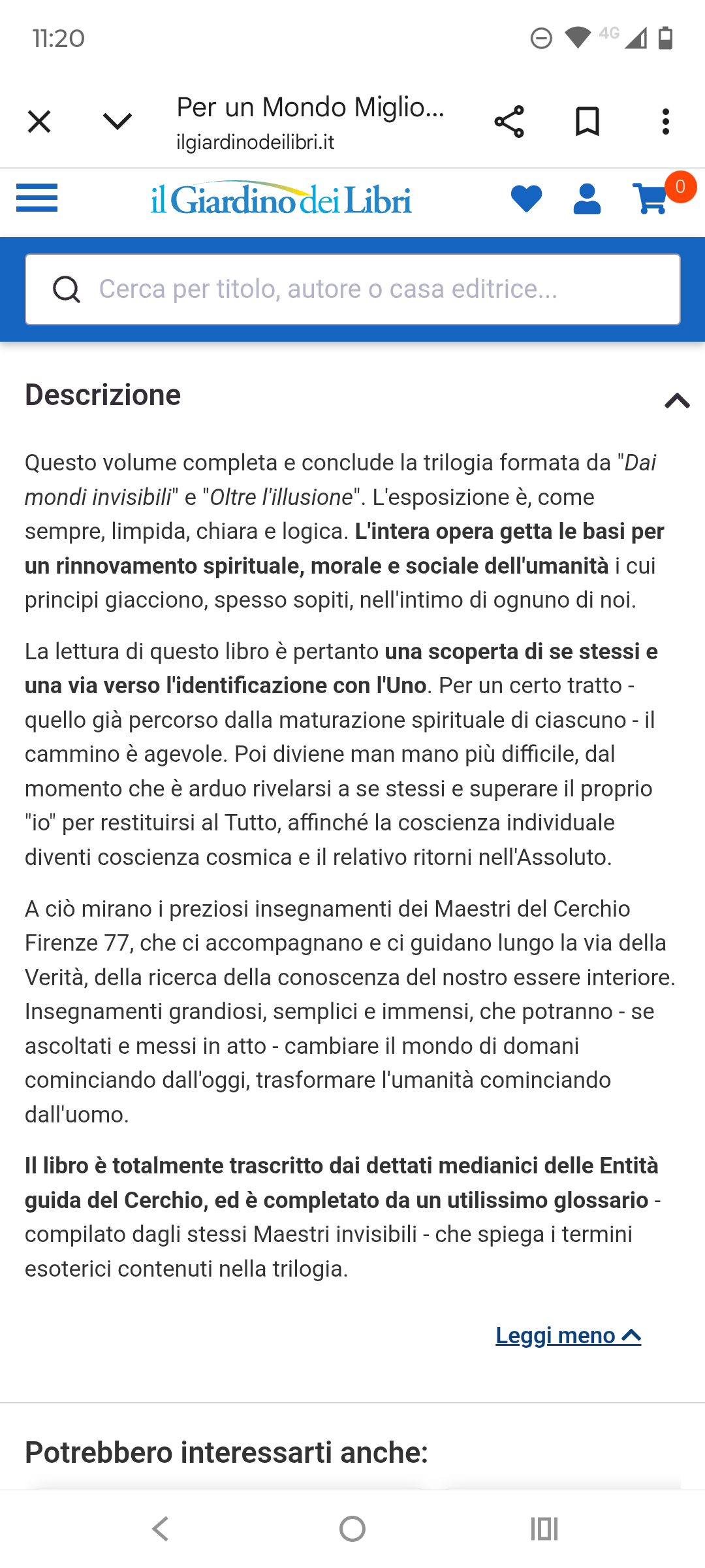 Screenshot che recita "Questo volume completa e conclude la trilogia formata da Dai mondi invisibili e Oltre l'illusione. L'esposizione è, come sempre, limpida, chiara e logica. L'intera opera getta le basi per un rinnovamento spirituale, morale e sociale dell'umanità i cui principi giacciono, spesso sopiti, nell'intimo di ognuno di noi. La lettura di questo libro è pertanto una scoperta di se stessi e una via verso l'identificazione con l'Uno. Per un certo tratto il cammino è agevole. Poi diviene man mano più difficile, dal momento che è arduo rivelarsi a se stessi e superare il proprio io per restituirsi al Tutto, affinché la coscienza individuale diventi coscienza cosmica e il relativo ritorni nell'Assoluto. A ciò mirano i preziosi insegnamenti dei Maestri del Cerchio Firenze 77, che ci accompagnano e ci guidano lungo la via della Verità, della ricerca della conoscenza del nostro essere interiore. Insegnamenti grandiosi, semplici e immensi, che potranno cambiare il mondo di domani cominciando dall'oggi, trasformare l'umanità cominciando dall'uomo. Il libro è totalmente trascritto dai dettati medianici delle Entità guida del Cerchio, ed è completato da un utilissimo glossario compilato dagli stessi Maestri invisibili che spiega i termini esoterici contenuti nella trilogia."