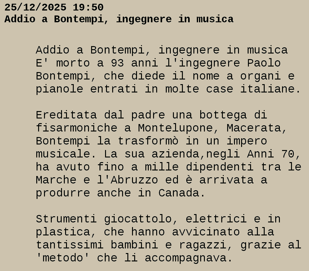 Da televideo RAI 25/12/2025 19:50 Addio a Bontempi, ingegnere in musica Addio a Bontempi, ingegnere in musica E' morto a 93 anni l'ingegnere Paolo Bontempi, che diede il nome a organi e pianole entrati in molte case italiane. Ereditata dal padre una bottega di fisarmoniche a Montelupone, Macerata, Bontempi la trasformΓ² in un impero musicale. La sua azienda,negli Anni 70, ha avuto fino a mille dipendenti tra le Marche e l'Abruzzo ed Γ¨ arrivata a produrre anche in Canada. Strumenti giocattolo, elettrici e in plastica, che hanno avvicinato alla tantissimi bambini e ragazzi, grazie al 'metodo' che li accompagnava.