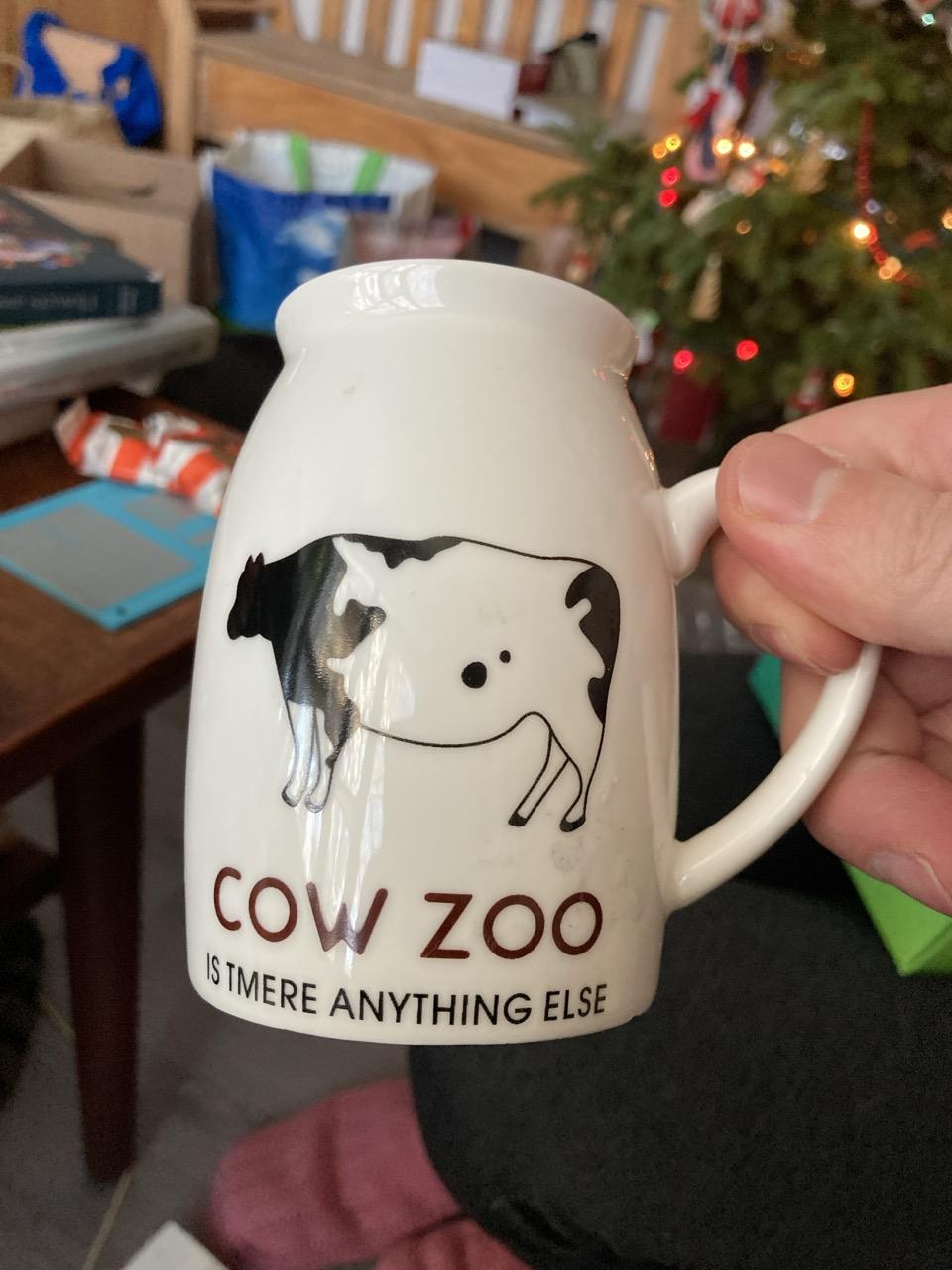 A mug with a holstein cow on the front that reads: cow zoo is tmerw anything else