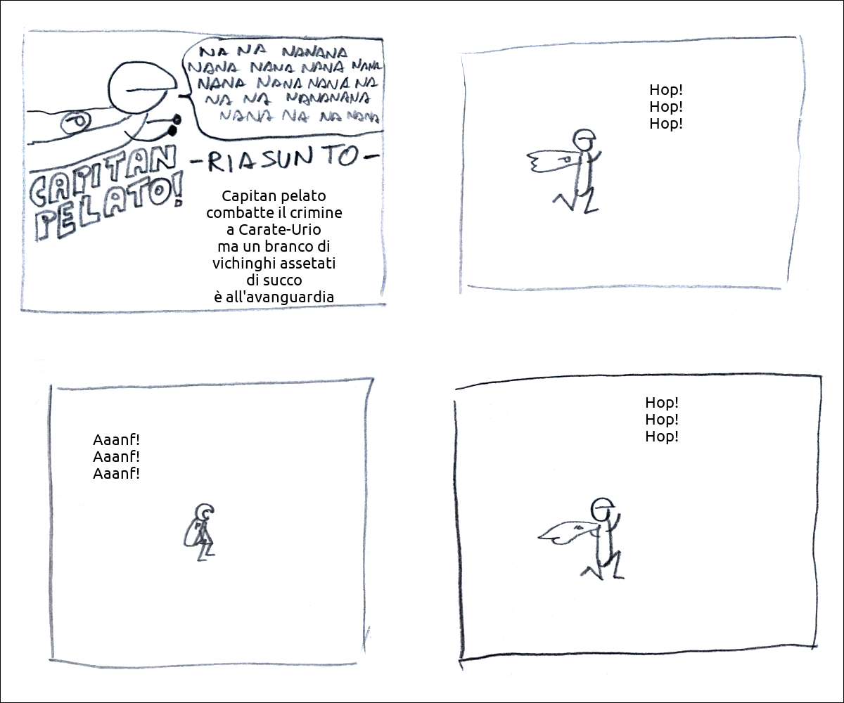 Capitan Pelato riassunto: «Capitan pelato combatte il crimine a Carate-Urio ma un branco di vichinghi assetati di succo è all'avanguardia» Capitan Pelato corre Capitan Pelato prende fiato Capitan Pelato corre