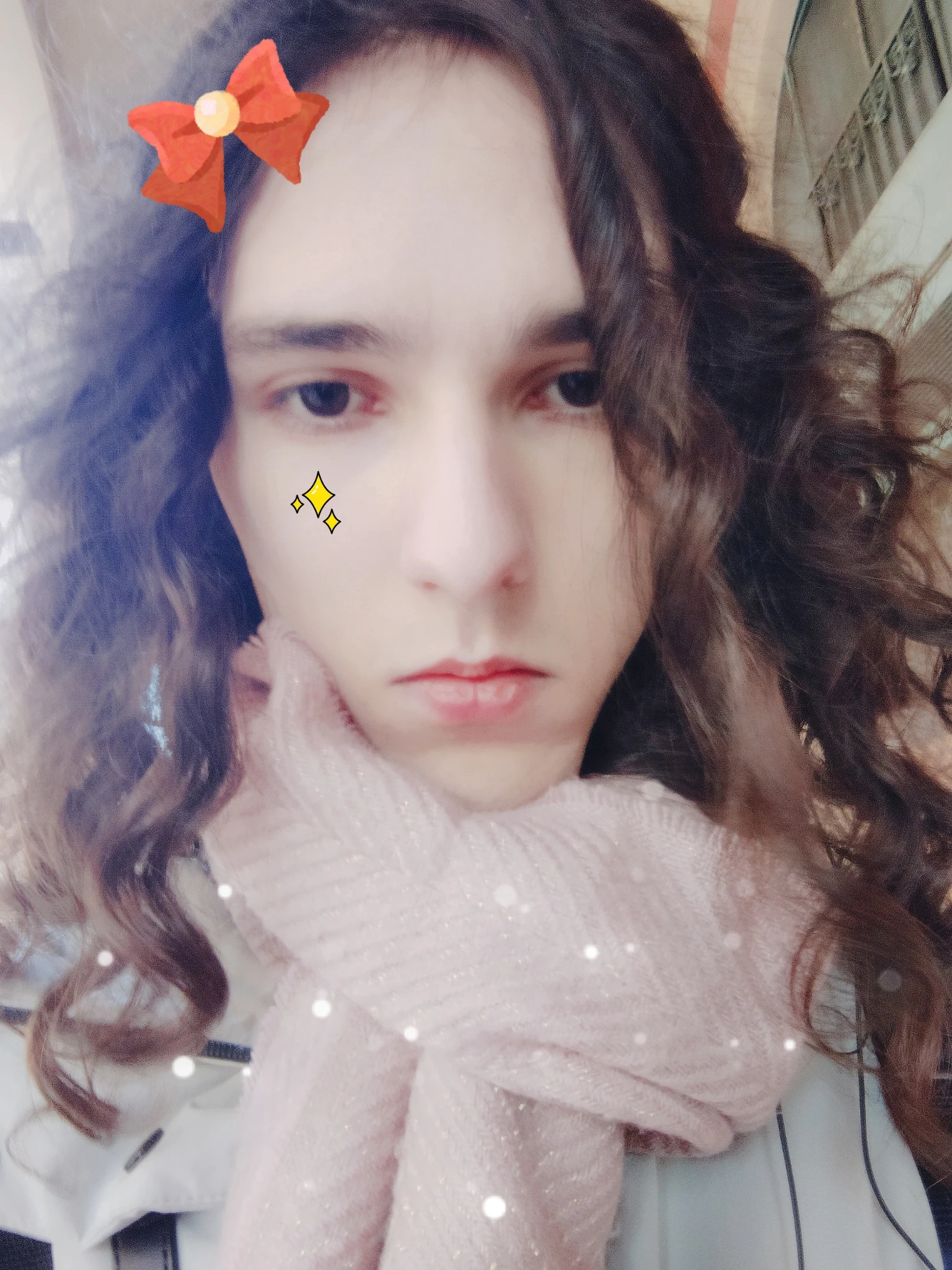 Selfie di me per strada. Ho i capelli a destra che tendono a cadersene davanti a me. Foto decorata con filtro angelico, e sticker di un fiocco rosso sui capelli, delle stelline gialle sotto agli occhi, e dei brilluccichii sotto.