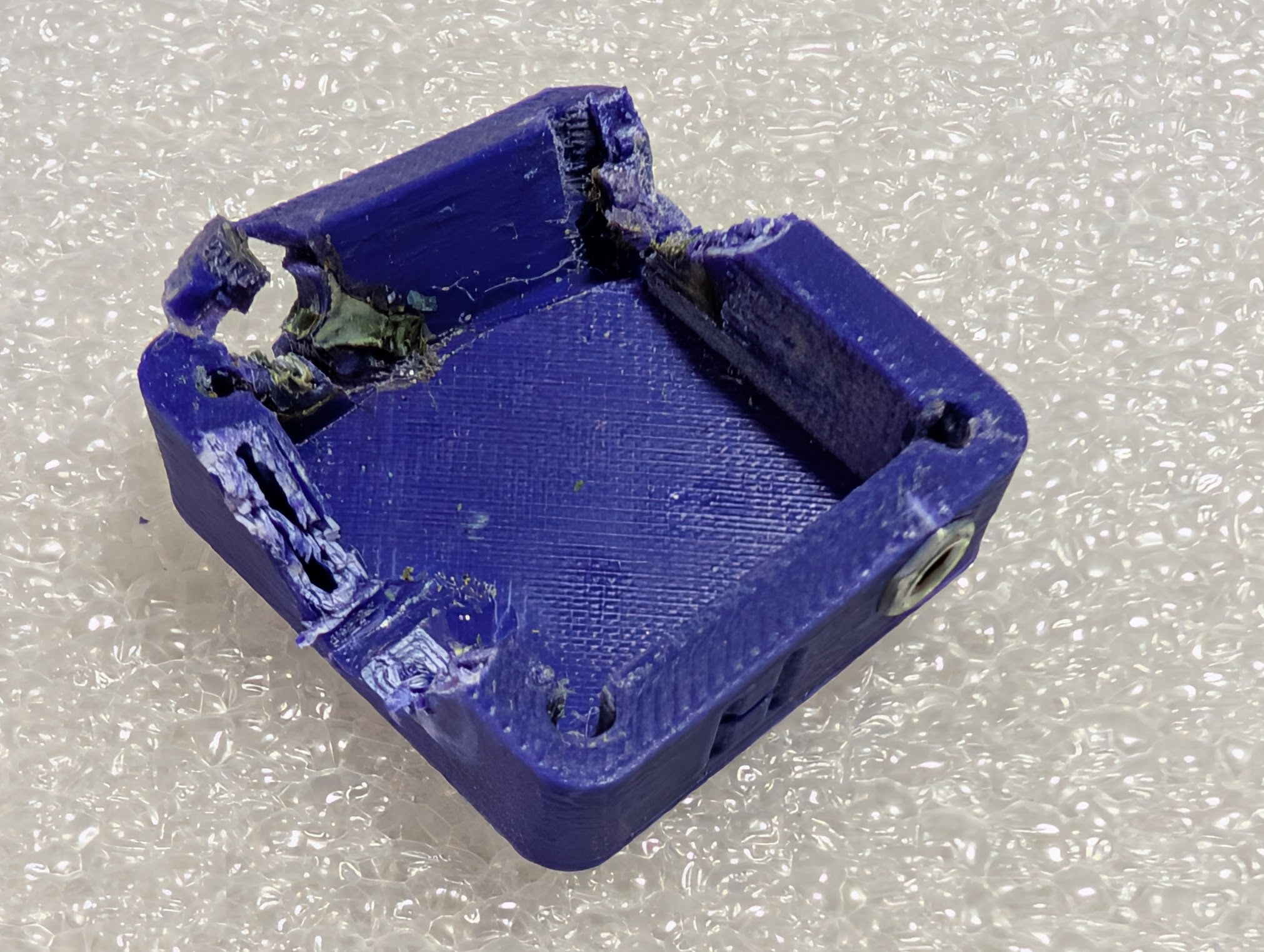 Damaged case with one side cracked off and pieces cut out for destructive disassembly to save the electrical parts for a new case.
