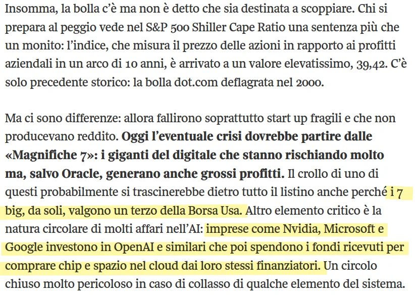 Estratto da "Scoppierà la bolla dell’Intelligenza artificiale?" di Massimo Gaggi sul corriere della sera, evidenziando la natura circolare delle aziende tech che da sole valgono un terzo della borsa USA