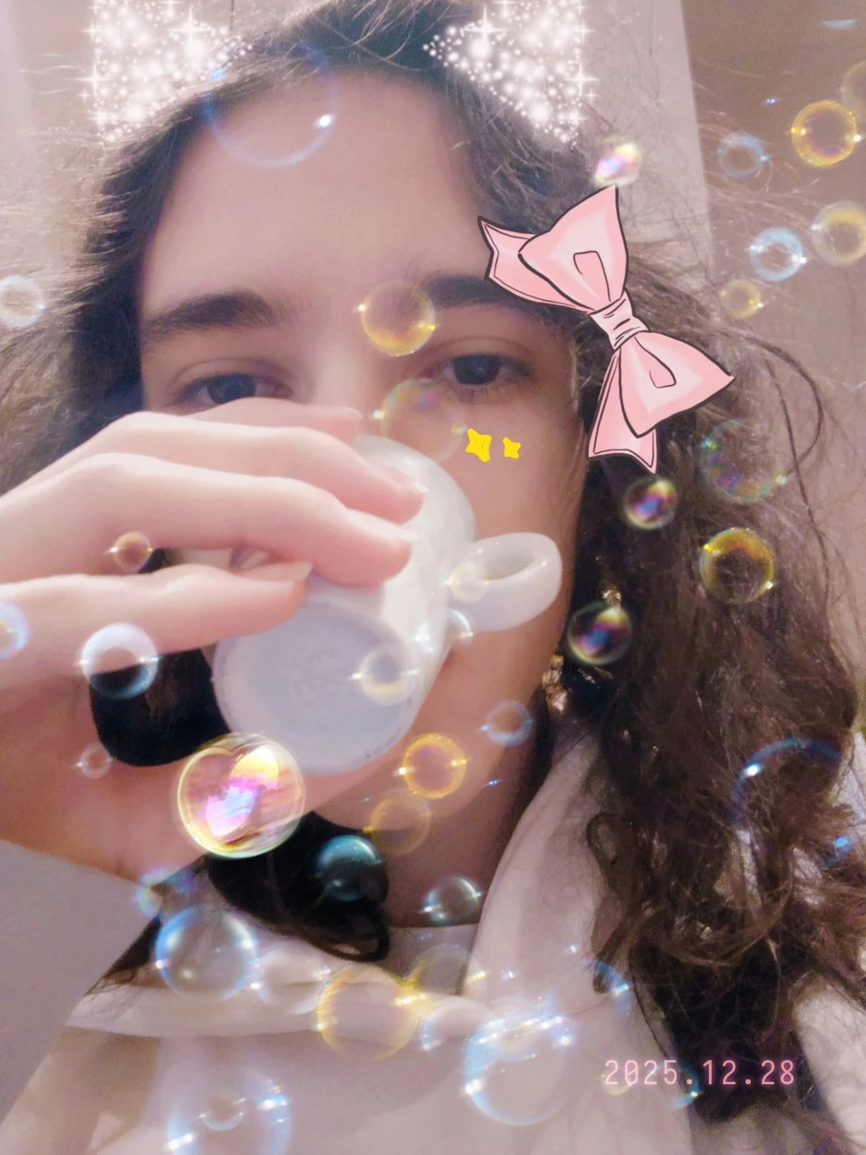 Selfie con la tazzina in mano, gnam. Filtro Bubble di OldRoll, e sticker vari sulla mia faccia (orecchie da gatto fatte tipo di stelle, fiocco rosa sui capelli di lato, e stelline sotto l'occhio)