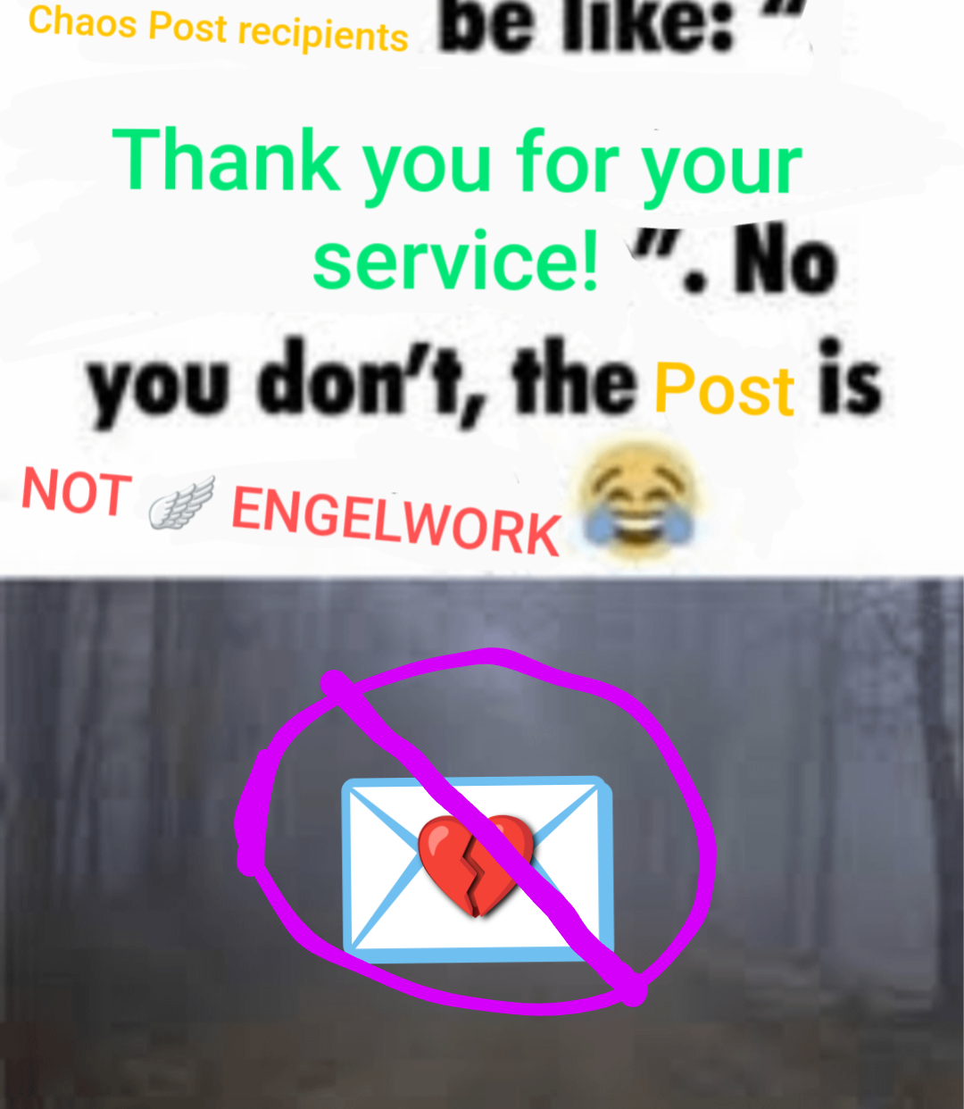 mens with heavily edited text with colors that don't matter for the meaning: Chaos Post recipients be like: "Thank you for your service!". No you don't, the Post is NOT 🪽 ENGELWORK 😂 (an image of fog in a forest and a mail with a broken heart icon and it's crossed out)