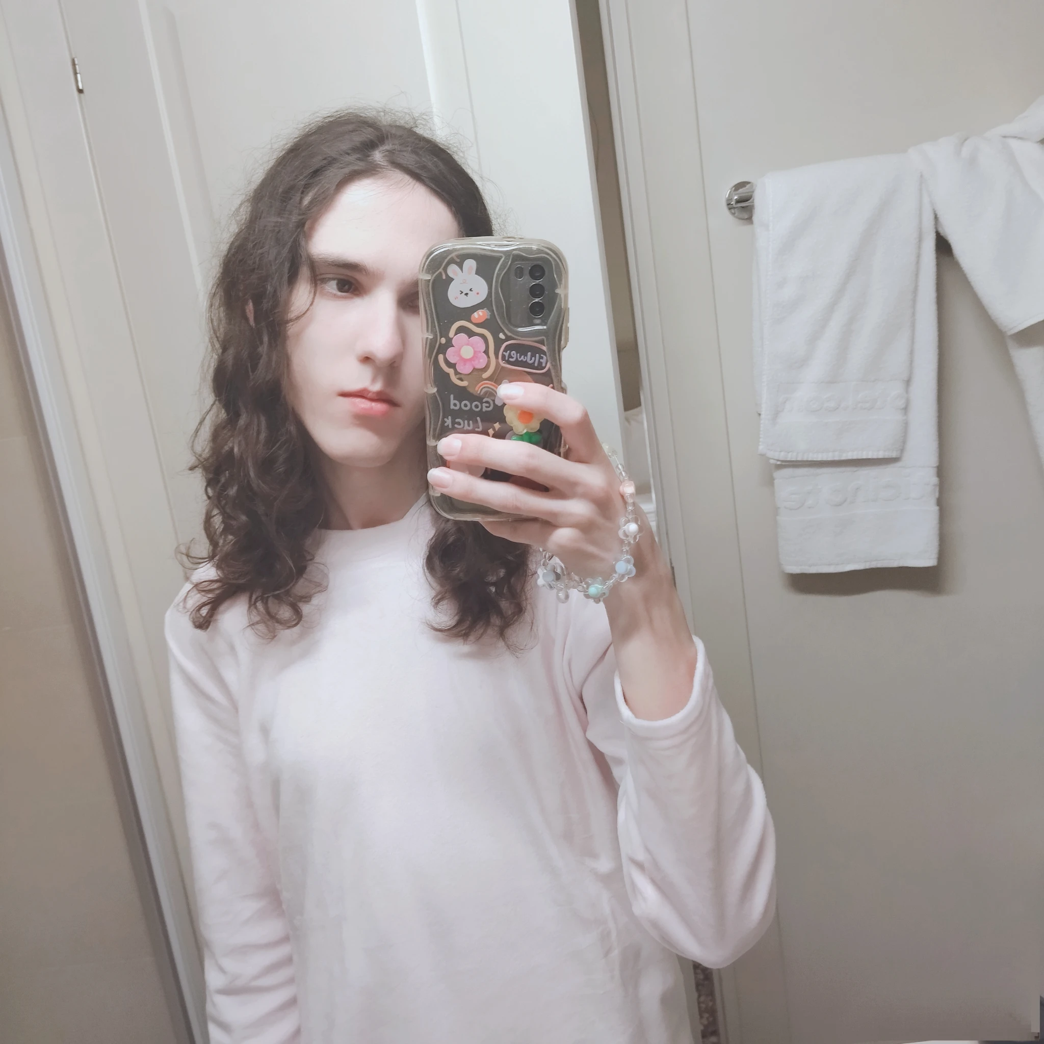 Selfie davanti allo specchio in bagno, con i capelli lavati da pochissimo asciugati, filtro chiareggiante di SNOW