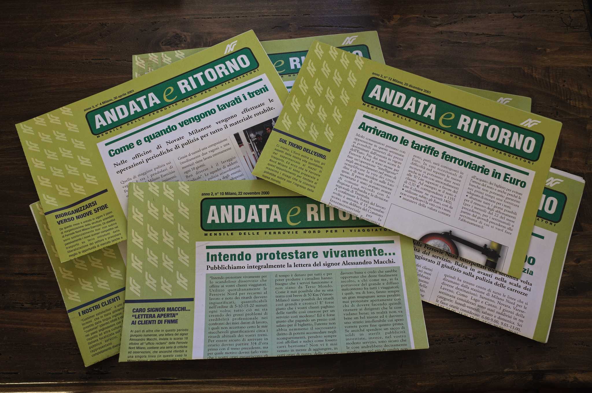 una pila di Andata e Ritorno, mensile delle Ferrovie Nord per i viaggiatori con titoli tipo “Come e quando vengono lavati i treni”, “Arrivano le tariffe ferroviarie in Euro” e “Intendo protestare vivamente…”