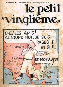 Le Petit Vingtième, number 32 from 1934. At the top, the publication information reads "SUPPLÉMENT AU 'VINGTIÈME SIÈCLE' • JEUDI 9 AOÛT 1934 — N° 32" followed by the title "le petit vingtième" in a distinctive gothic/blackletter-style typeface on an aged, cream-colored background. The cover features a single-panel cartoon showing a young boy character in shorts standing on what appears to be a map. He has his arms outstretched in an animated pose. Behind/beneath the character is a simplified map showing parts of Europe and North Africa. https://en.wikipedia.org/wiki/Le_Petit_Vingti%C3%A8me#/media/File:Le_Petit_Vingti%C3%A8me_number_32.jpg