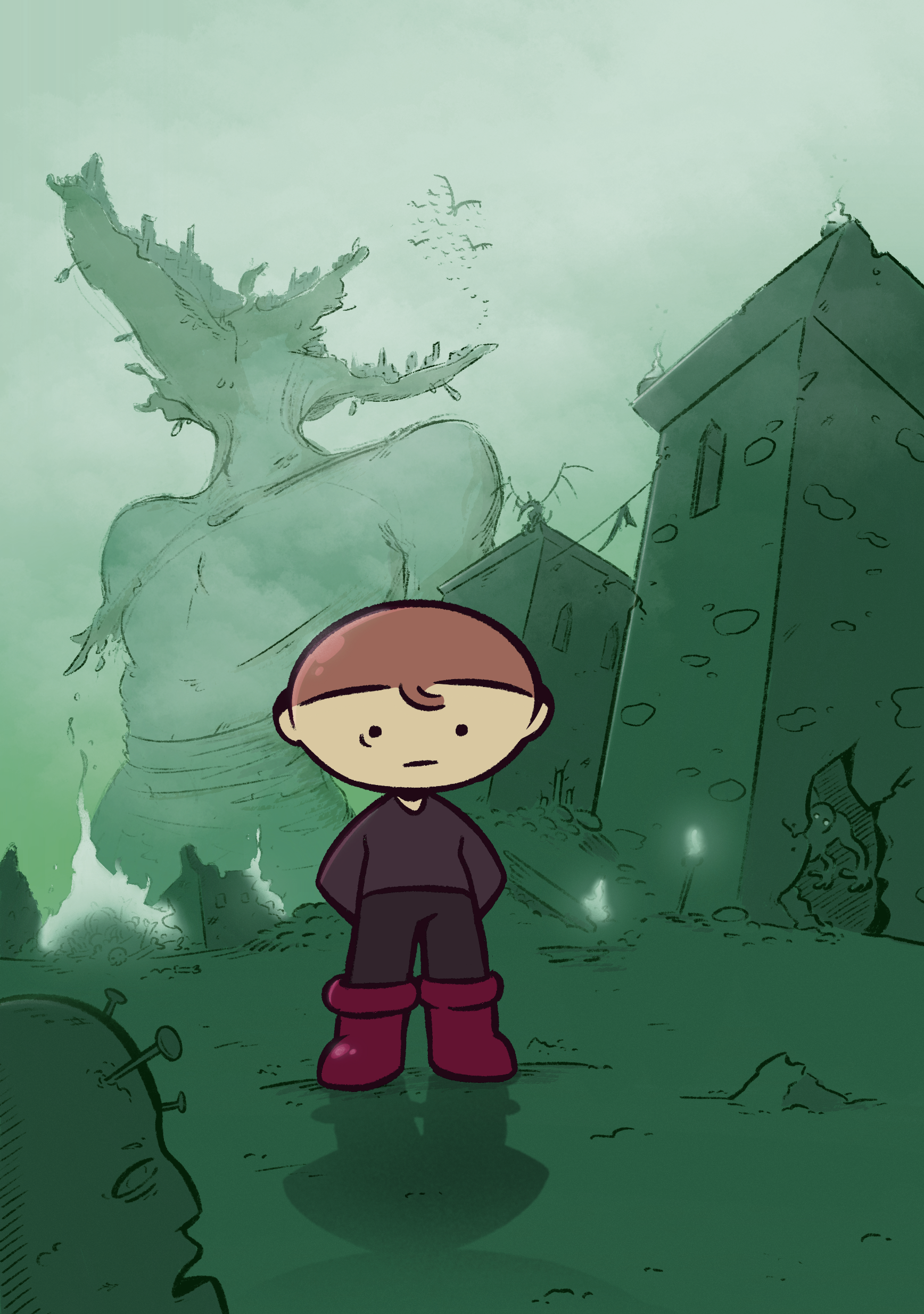 Concept art. Un bambino con grandi scarpe rosse e uno sguardo privo di emozioni guarda l'osservatore. lo scenario รจ di un verde malaticcio, ambiente diroccato con edifici in rovina, incendi, mostri ed un gigantesco corpo umano con una testa simile ad un fiore aperto รจ nascosta dalla nebbia nella distanza