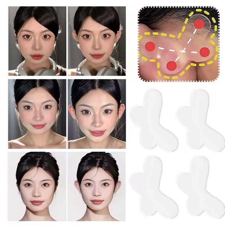 Series of photos showing before and after putting stickers behind your ears that make them stick out more.