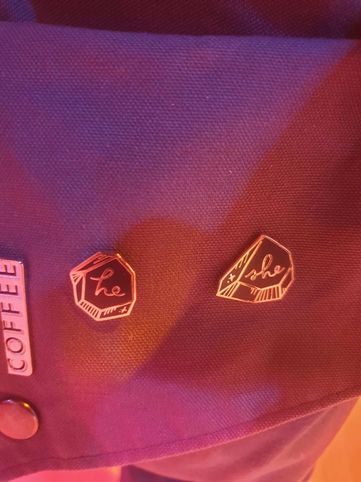 Two pins styled after rough-hewn rocks. They are black with gold line art and lettering, and they read "he" and "she". The matching "they" pin is missing.