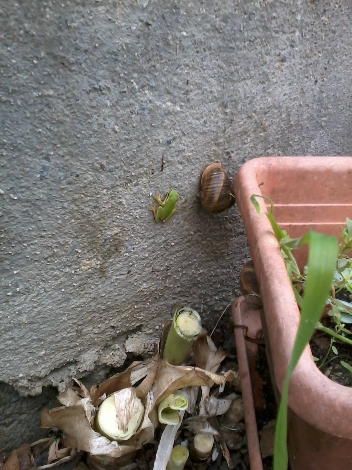 a frog and a snail on a wall. The snail is far larger than the frog.