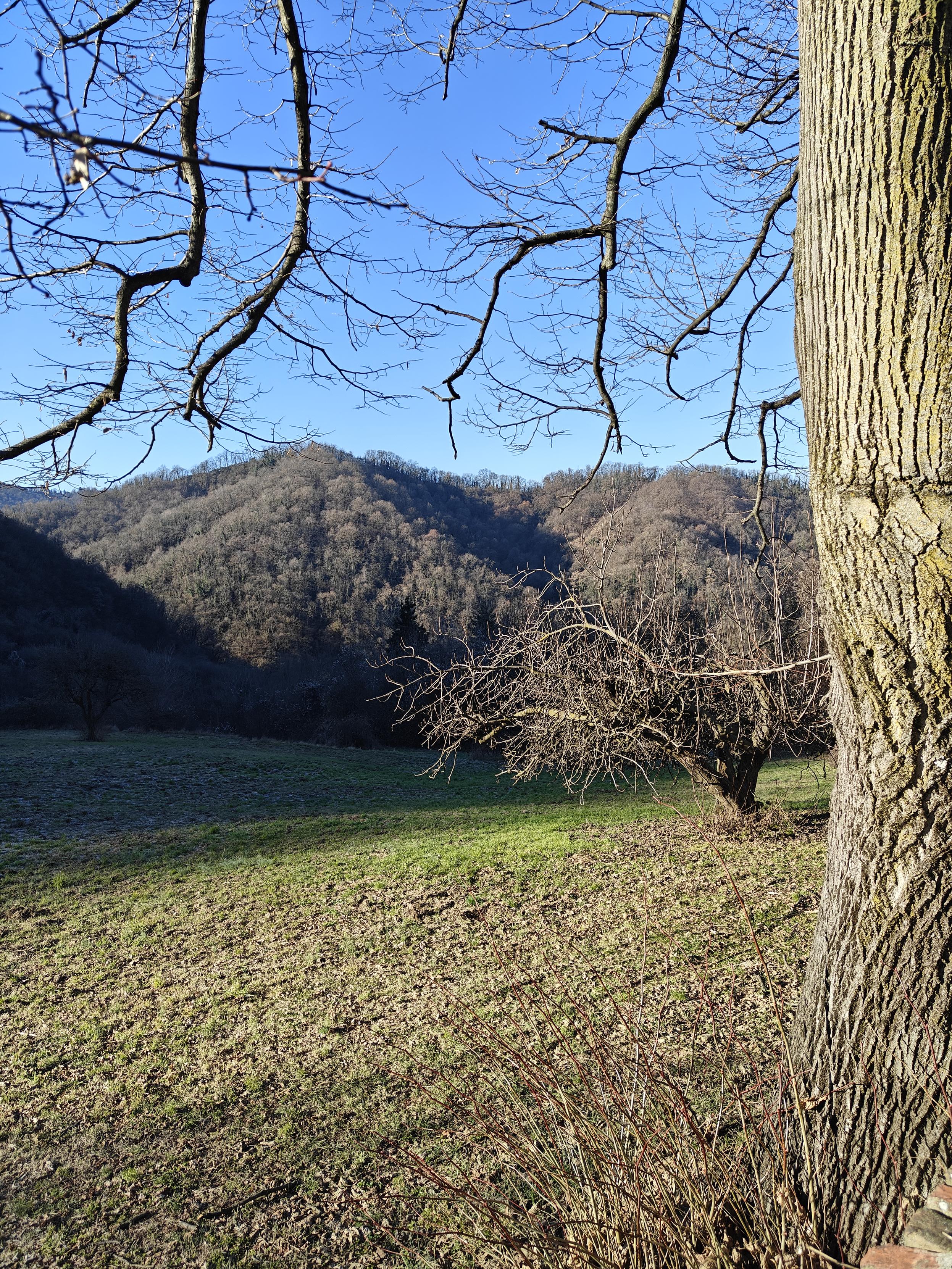 Una veduta paesaggistica di colline boscose sotto un cielo blu limpido. In primo piano a destra spicca il tronco di un grande albero, mentre rami spogli scendono dall'alto incorniciando la scena. Un prato leggermente in ombra digrada verso una valle, oltre la quale si elevano colline ricoperte da una fitta vegetazione invernale priva di foglie, illuminate dal sole.