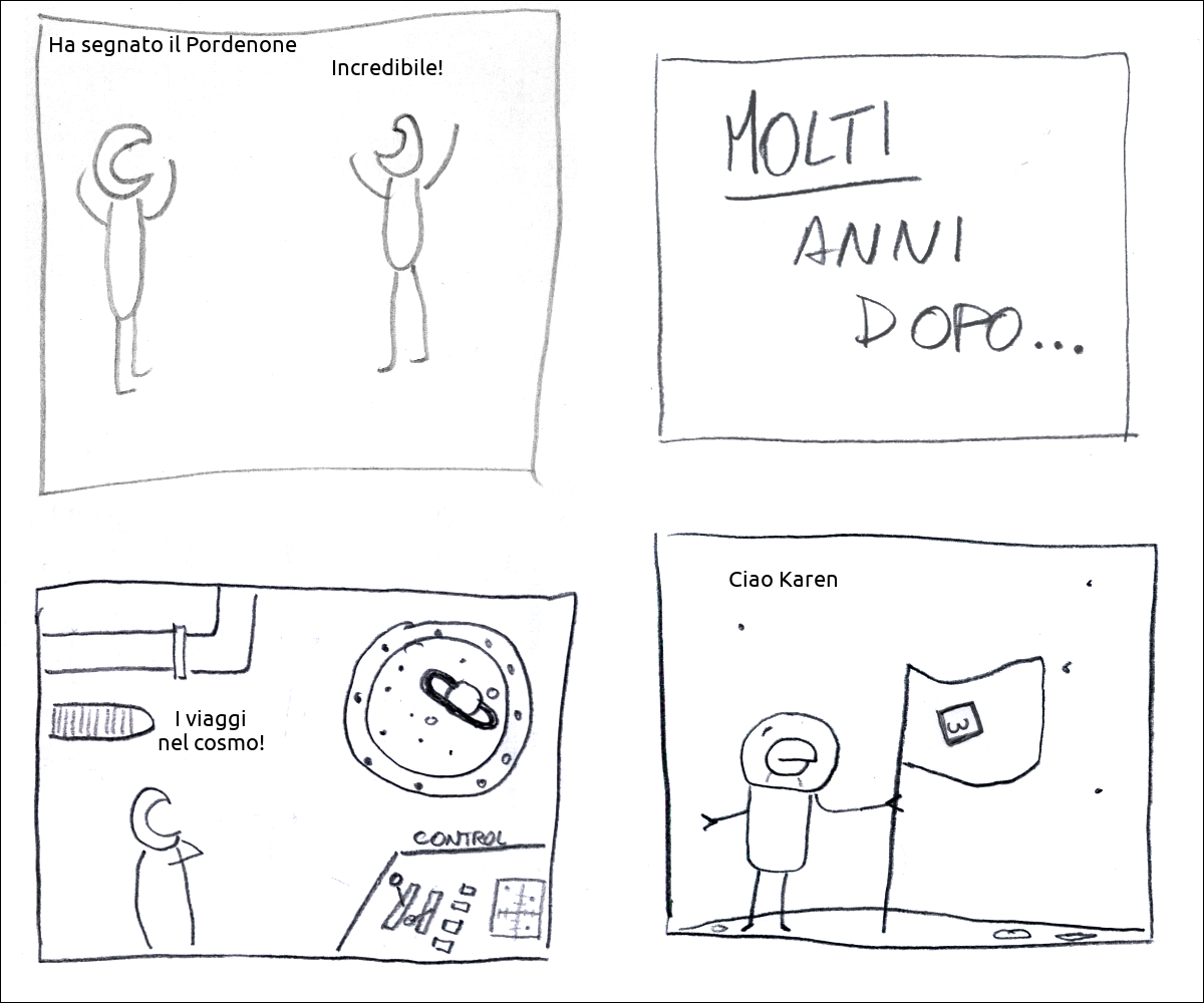 un tizio dice: «Ha segnato il Pordenone», un altro risponde: «Incredibile!» didascalia: molti anni dopo... un tizio è su una astronave e dice: «I viaggi nel cosmo!» il tizio pianta una bandiera che rappresenta una foto di natiche su un pianeta e dice: «Ciao Karen»