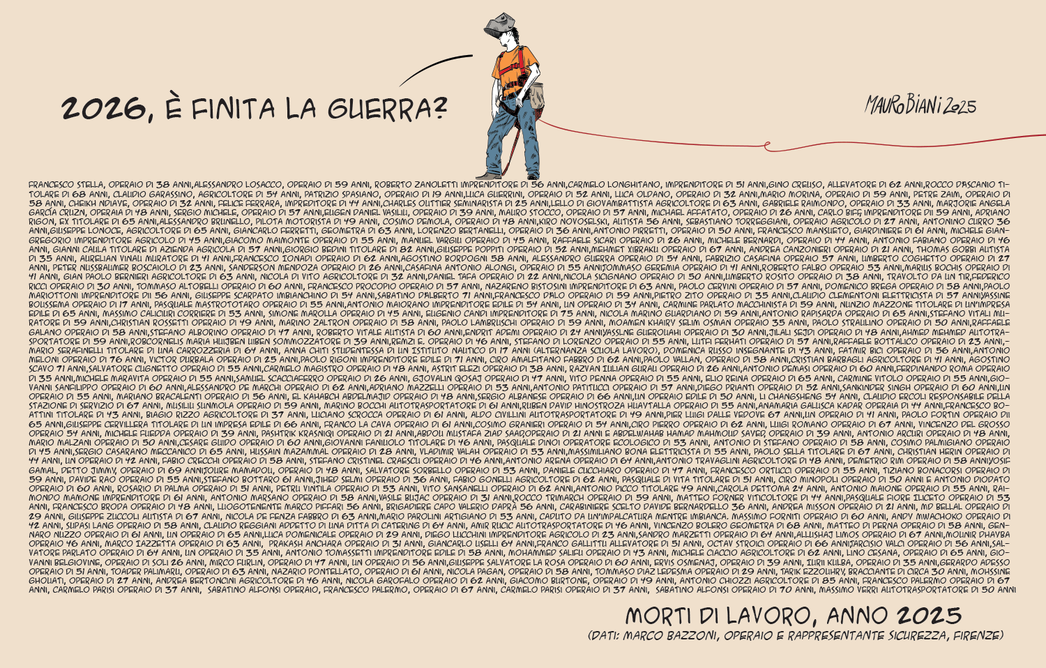 operaio sopra un muro di nomi, morti sul lavoro. 2026, รจ finita la guerra?
