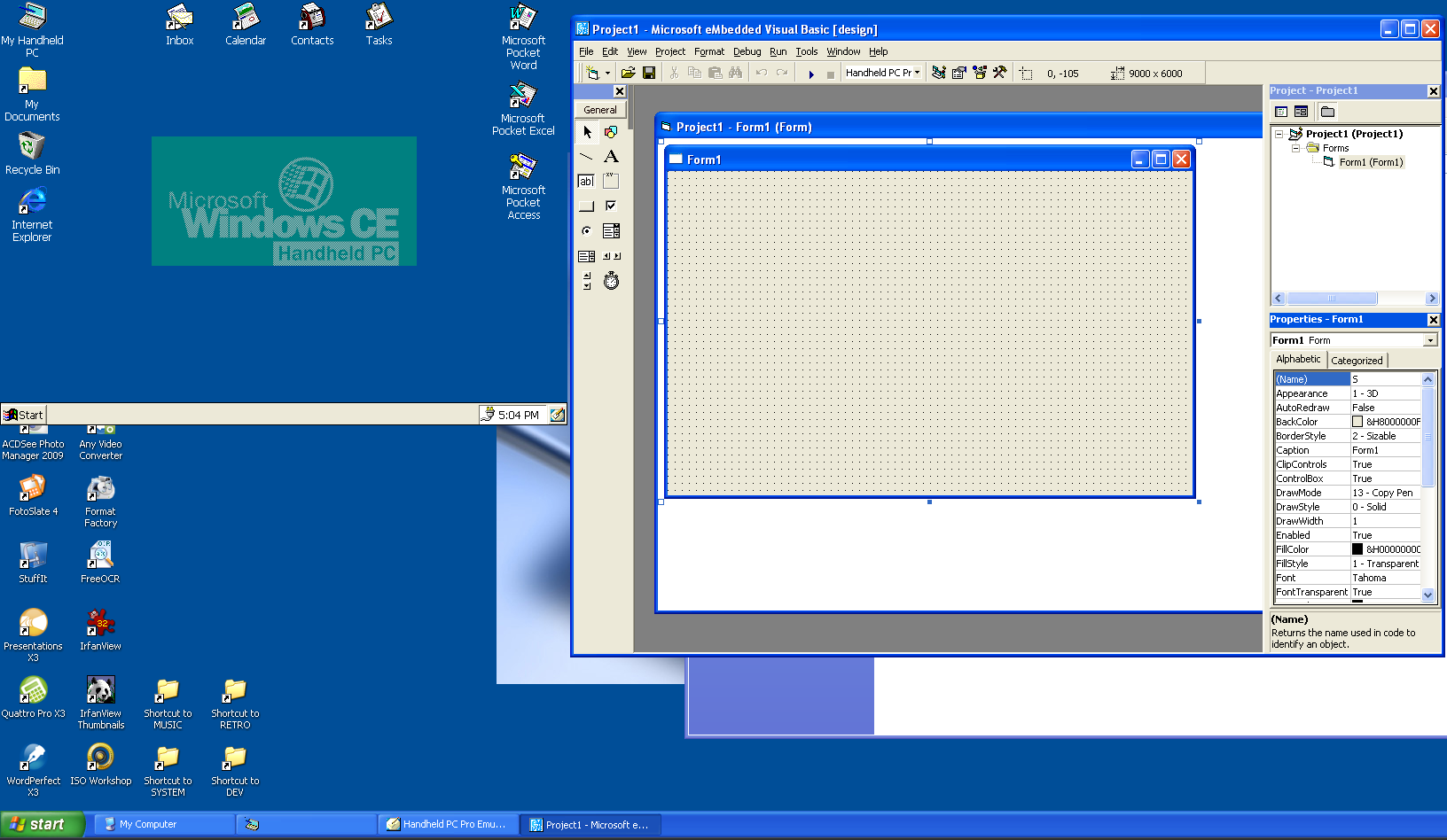 In this screenshot there is WindowsXP running under VirtualBox on my Linux box. To the left: the Win CE emulator To the right: The Visual Basic Editor Bottom: a part of the WindowsXP desktop and its bar.